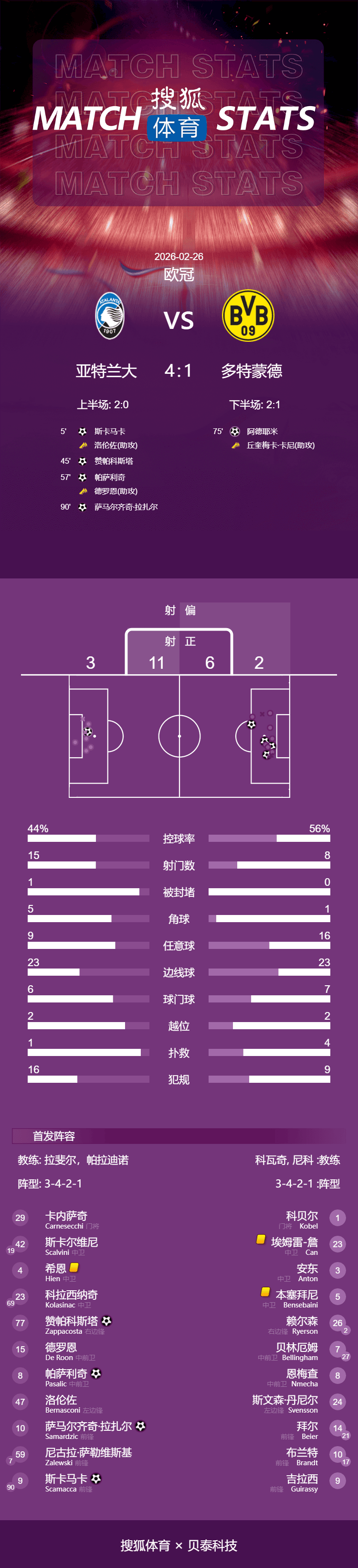 เวลา 01:45 น. ตามเวลาปักกิ่ง วันที่ 26 กุมภาพันธ์ การแข่งขันยูฟ่าแชมเปียนส์ลีก 2025/26 รอบน็อคเอาท์เพลย์ออฟ นัดที่สอง แอตาลันต้าเปิดบ้านต้อนรับโบรุสเซีย ดอร์ทมุนด์ ในนัดแรก ดอร์ทมุนด์เอาชนะแอตาลันต้าไปได้ 2-0 ในบ้านตัวเอง ในครึ่งแรก แอตาลันต้าทำประตูขึ้นนำอย่างรวดเร็วจากสกามัคก้า ก่อนจะเพิ่มประตูที่สองเข้าไป ทำให้จบครึ่งแรกด้วยสกอร์นำสองประตูในครึ่งหลัง ปิยาคา โหม่งทำประตูให้ดอร์ทมุนด์ขึ้นนำในสกอร์รวม แต่แล้วอาเดเยมีก็ตีเสมอได้ด้วยลูกโค้งสวยงาม ในช่วงทดเวลาบาดเจ็บ เบนเซบายนีทำฟาวล์ในเขตโทษและถูกไล่ออกจากสนามหลังจากได้รับใบเหลืองที่สอง ซามาร์ดซิชยิงจุดโทษเข้าไปปิดท้ายชัยชนะ ในที่สุดอตาลันตาก็เอาชนะโบรุสเซีย ดอร์ทมุนด์ 4-1 และผ่านเข้ารอบ 16 ทีมสุดท้ายด้วยสกอร์รวม 4-3