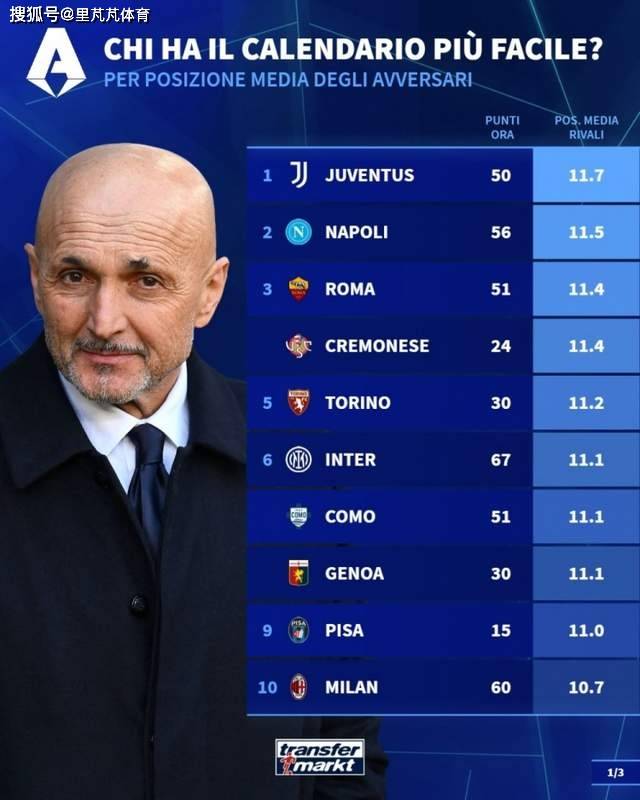 ตลาดการโอนย้ายเยอรมันนับอันดับเฉลี่ยของ 10 รอบที่เหลือของแต่ละทีมในเซเรีย อา. ยูเวนตุสถึง 11 อันดับเฉลี่ยของคู่ต่อสู้ 7 คนกลายเป็นทีมที่ผ่อนคลายที่สุดสำหรับตารางที่เหลือคือนาโปลี (11.5) และโรม (11 4) อันดับสองหรือสาม เครโมนีสและตูรินคือ 11 4 เสมอที่สี่