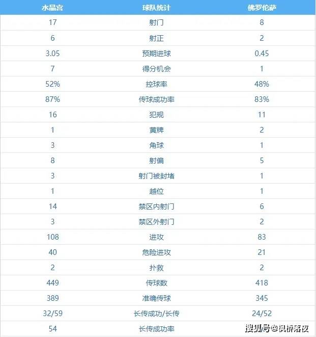 ในเกมทบทวน ฟลอเรนซ์มีอัตราการครองบอล 58% แต่ข้อมูลหลักคือ: มีการฆ่าออร์โธดอกซ์เพียงไม่กี่ครั้ง ข้อผิดพลาดร้ายแรงบ่อยครั้ง และประสิทธิภาพในการตัดสินใจต่ำในสามเขตรุก ในทางกลับกัน คริสตัล พาเลซ ที่อยู่เบื้องหลัง 3 ประตู คือการเปลี่ยนใจเลื่อมใสและเกมรับที่รวดเร็วและคว้าโอกาสที่เย็นชา