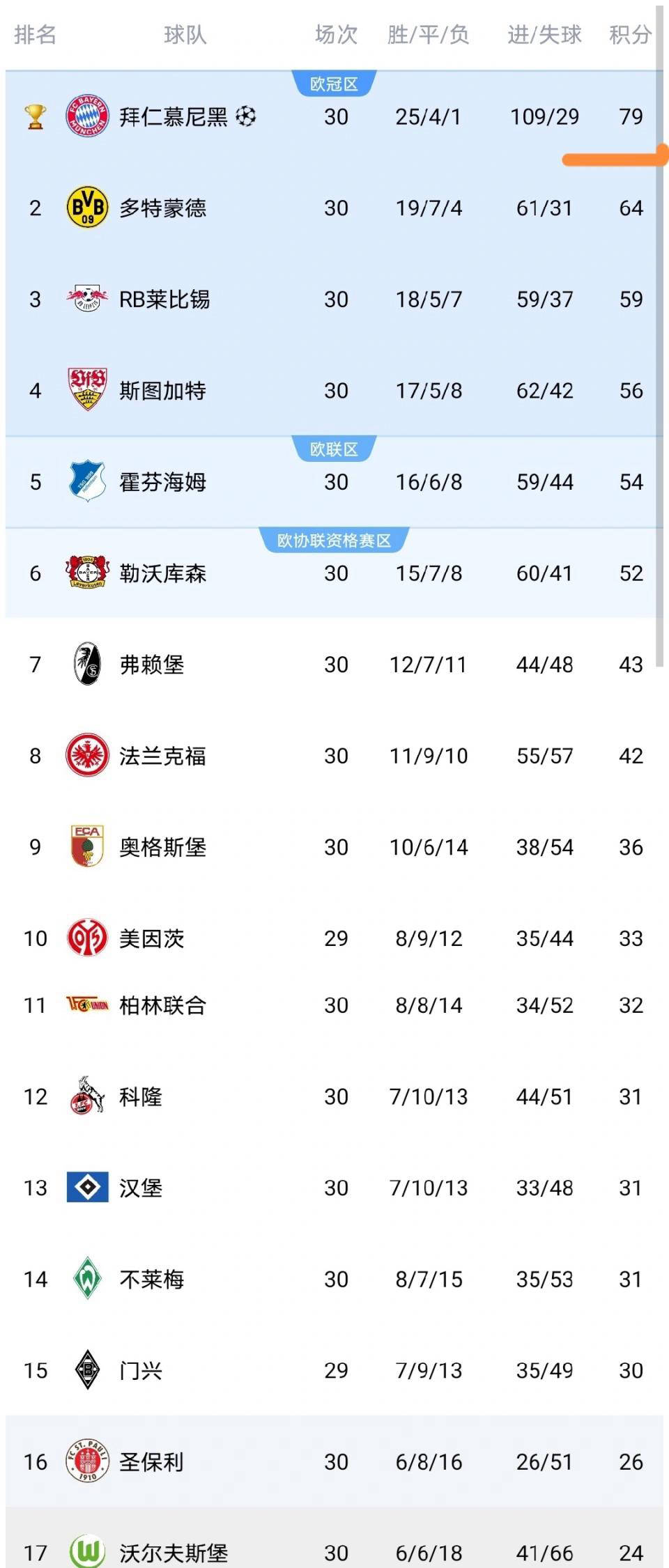 ด้วยชัยชนะครั้งนี้ คะแนนของบาเยิร์นพุ่งขึ้นถึง 79 แต้ม ล็อคแชมป์บุนเดสลีกาได้สำเร็จก่อนกำหนดสี่นัด ทำได้สำเร็จในการป้องกันแชมป์ สิ่งนี้ไม่เพียงแสดงให้เห็นถึงความแข็งแกร่งและความมั่นคงโดยรวมของบาเยิร์นเท่านั้น แต่ยังทำให้พวกเขาครองเกมฟุตบอลชั้นนำของเยอรมันต่อไป ในเวลาเดียวกัน การเปลี่ยนแปลงอื่นๆ ในอันดับก็ได้รับความสนใจเช่นกัน โดยเฉพาะอย่างยิ่งการแข่งขันเพื่อคัดเลือกแชมเปี้ยนส์ลีกนั้นเข้มข้นกว่า แมตช์นี้จุดประกายความกระตือรือร้นในการแข่งขันของลีกอย่างสมบูรณ์ และการแข่งขันอีกสองสามรอบถัดไปก็คุ้มค่าเช่นกัน รายชื่อผู้ทำประตูและข้อมูลต่างๆ จะได้รับการอัปเดตอย่างต่อเนื่องในครั้งต่อไป โดยนำเสนอหน้าจอการแข่งขันที่น่าตื่นเต้นที่สุดของบุนเดสลีกาในฤดูกาลนี้