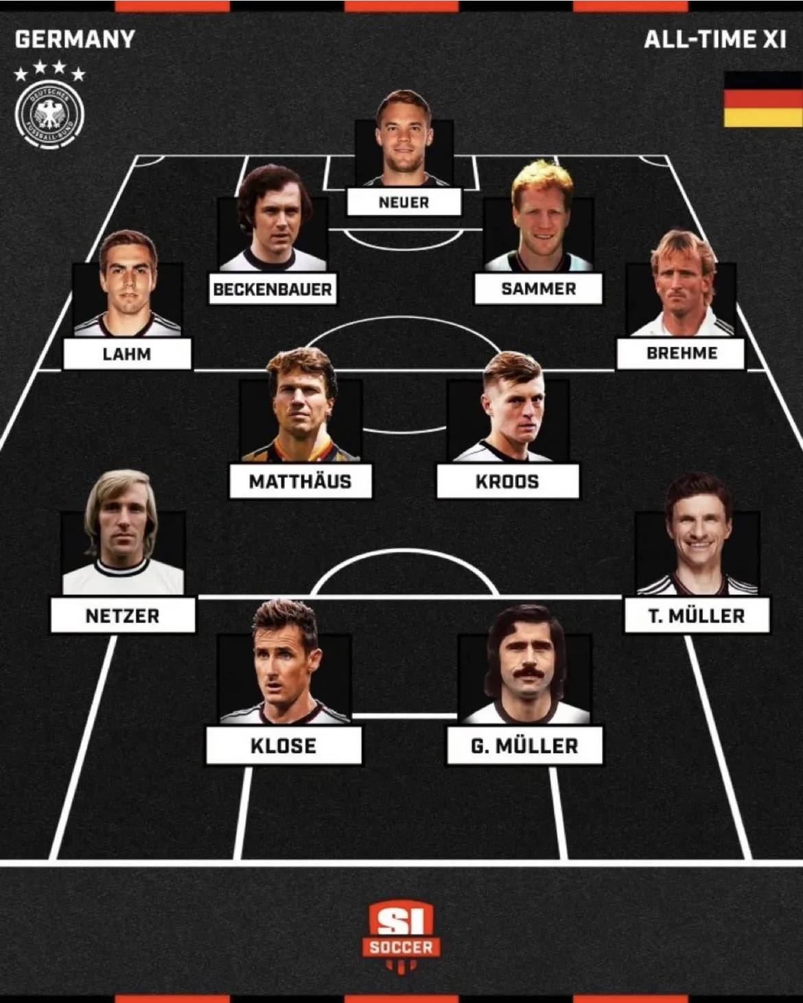 เมื่อเร็ว ๆ นี้ SI Soccer ได้เปิดเผยรายชื่อทีมที่ยิ่งใหญ่ที่สุดตลอดกาลของเยอรมนี ซึ่งประกอบด้วยนักเตะชื่อดังอย่าง เบ็คเคนบาวเออร์, มัทเธอุส, โครส และมุลเลอร์ อย่างไรก็ตาม มีนักเตะชื่อดังอย่าง บาเยอร์, บัลลัค และคลินส์มันน์ ที่ไม่ได้ถูกคัดเลือกในครั้งนี้ ซึ่งการตัดสินใจนี้ได้ก่อให้เกิดการถกเถียงอย่างมาก และสมควรได้รับการตรวจสอบเพิ่มเติม