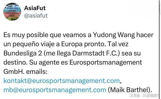 วันที่ 27 พฤศจิกายน 2568 ตามรายงานของ AsiaFut – สื่อชื่อดังที่เชี่ยวชาญด้านฟุตบอลเอเชีย – คาดว่า หวัง ยู่ตง กองหน้าทีมชาติจีน จะย้ายไปร่วมทีมดาร์มสตาท ทีมในบุนเดสลีกา 2 ในช่วงตลาดซื้อขายนักเตะฤดูหนาวเป็นที่เข้าใจกันว่า หวังจะเข้าร่วมสโมสรด้วยสัญญายืมตัว การย้ายครั้งนี้เกิดขึ้นหลังจากที่เขาเพิ่งเซ็นสัญญากับ EuroSportsManagement ซึ่งเป็นเอเจนซี่ที่เชี่ยวชาญในตลาดฟุตบอลยุโรปที่ใช้ภาษาเยอรมัน รวมถึงบุนเดสลีกา, บุนเดสลีกา 2 และสวิส ซูเปอร์ลีก ความร่วมมือนี้บ่งชี้อย่างชัดเจนว่าหวังกำลังจะย้ายไปเล่นในลีกระดับสองของเยอรมนีในเร็วๆ นี้
