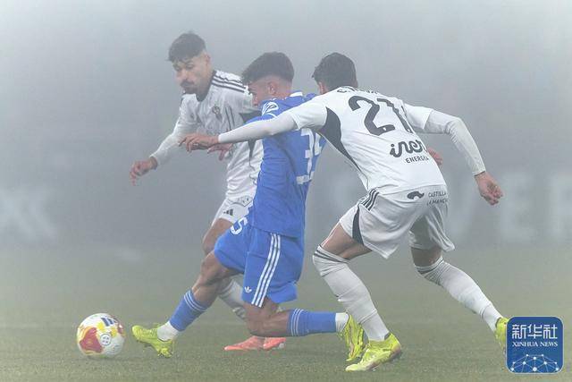 เบนาเวีย ผู้เล่นของอลาเบส (กลาง) เข้าปะทะกับวินิซิอุสของเรอัล มาดริด (ซ้าย) ระหว่างการแข่งขัน