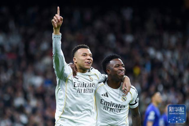 ↑ นักเตะเรอัล มาดริด คีเลียน เอ็มบัปเป้ (ซ้าย) และ วินิซิอุส จูเนียร์ ฉลองประตู