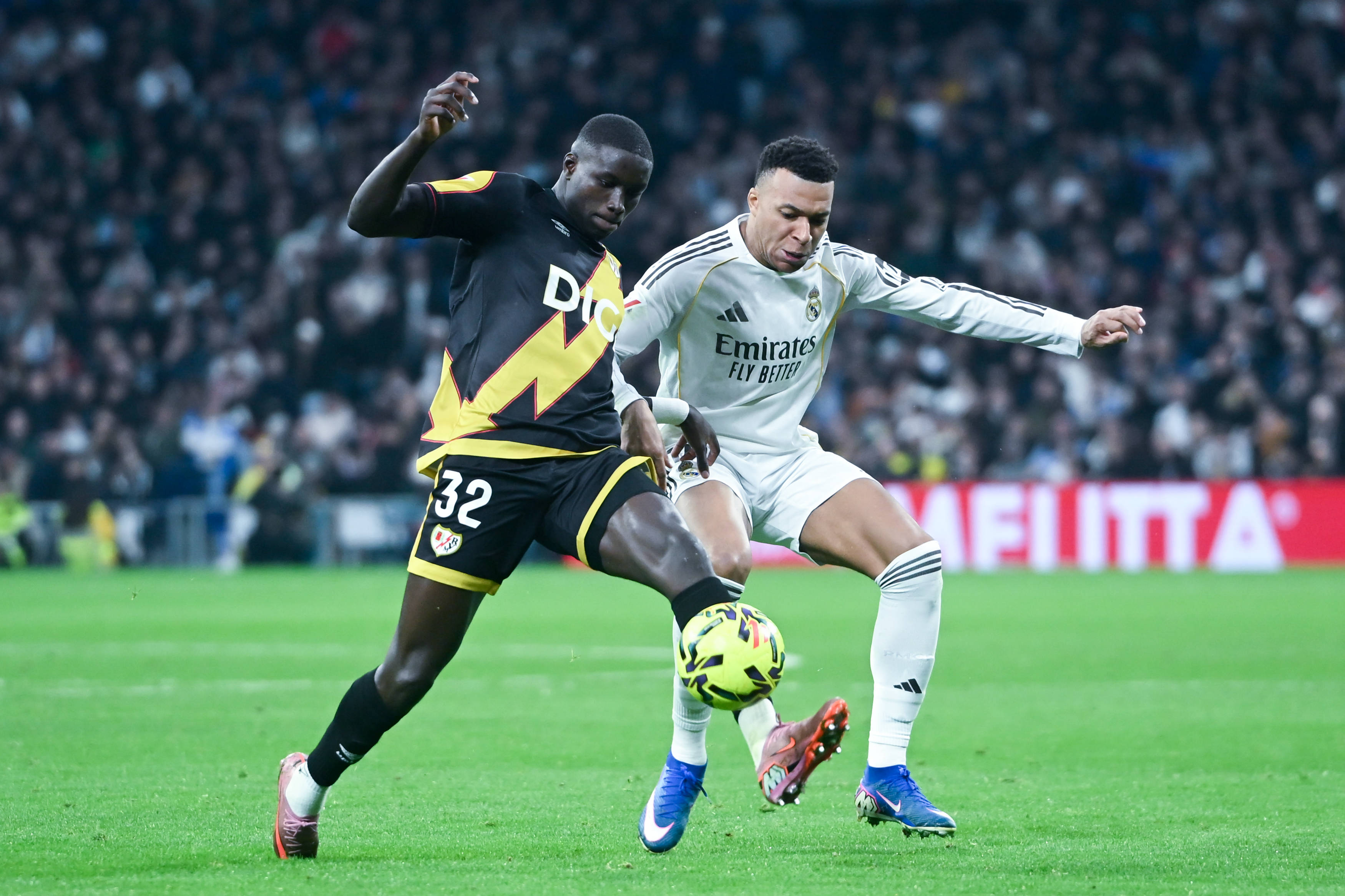 เมื่อวันที่ 1 กุมภาพันธ์ คีเลียน เอ็มบัปเป้ ของเรอัล มาดริด (ขวา) เข้าแย่งบอลกับ โนลแบร์ต์ เมนดี้ ของราโย บาเยกาโน่ สำนักข่าวซินหัว (ภาพโดย กุสตาโว บาร์เรียโตส)