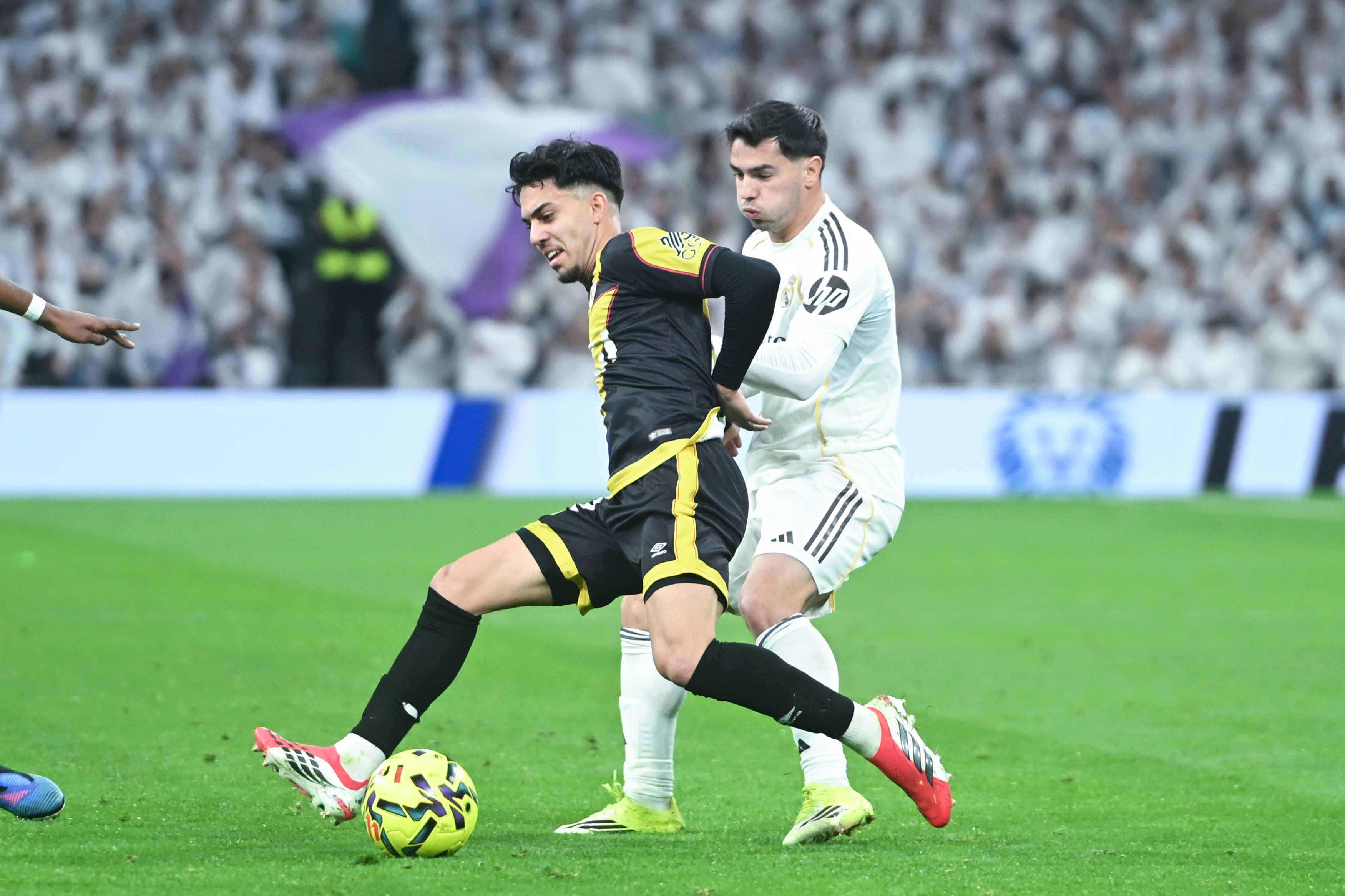 เมื่อวันที่ 1 กุมภาพันธ์ บราฮิม ดิอาซ ของเรอัล มาดริด (ขวา) เข้าปะทะกับ อิลิยาส ของราโย บาเยกาโน เพื่อแย่งบอล สำนักข่าวซินหัว (ภาพโดย กุสตาโว บาร์เรียนโตส)