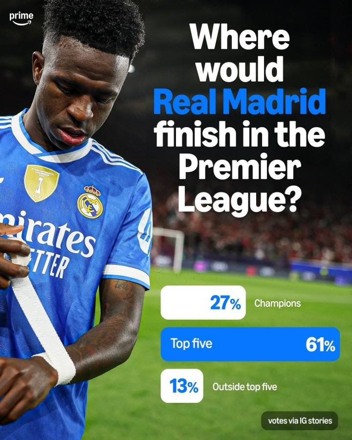 ในฐานะหนึ่งในสโมสรฟุตบอลที่ทรงอิทธิพลที่สุด เรอัล มาดริด ได้ใช้เวลาส่วนใหญ่ในประวัติศาสตร์ลาลีกาในการต่อสู้อย่างดุเดือดกับบาร์เซโลนาเพื่อชิงตำแหน่งแชมป์ลีก ด้วยพรีเมียร์ลีกที่ปัจจุบันได้รับความสนใจ อิทธิพล และรายได้สูงสุดในวงการฟุตบอลโลก จึงเป็นเรื่องธรรมดาที่แฟนบอลจะสงสัยว่าเรอัล มาดริดจะอยู่ในอันดับใดหากพวกเขาได้แข่งขันในลีกสูงสุดของอังกฤษผู้ประกาศข่าว Amazon ได้ทำการสำรวจความคิดเห็นของแฟนบอลโดยตั้งคำถามนี้อย่างชัดเจน: ทีมเรอัล มาดริดชุดปัจจุบันจะจบอันดับที่เท่าไรในพรีเมียร์ลีก? ผลการโหวตเปิดเผยว่ามีเพียง 27% ของผู้ตอบแบบสอบถามที่เชื่อว่าสโมสรจะคว้าแชมป์ได้ 61% ของแฟนบอลคาดการณ์ว่าเรอัล มาดริดจะจบในอันดับท็อปไฟว์ ขณะที่ 13% คาดว่าทีมจะไม่สามารถผ่านเข้าไปเล่นในยูฟ่าแชมเปียนส์ลีกได้