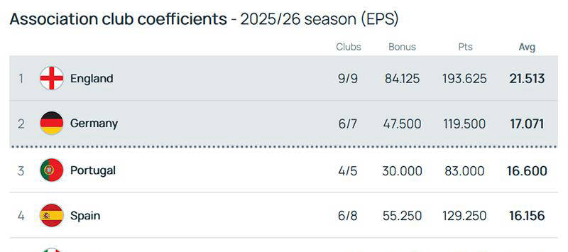 การจัดอันดับสัมประสิทธิ์ล่าสุดของยูฟ่าเปิดเผยว่า พรีเมียร์ลีกเป็นผู้นำตารางด้วยคะแนน 21.513 คะแนน นำหน้าบุนเดสลีกาที่อยู่ในอันดับสองถึง 4 คะแนน ลีกโปรตุเกส, สเปน และอิตาลีตามมาติด ๆ โดยแต่ละลีกมีคะแนนห่างกันน้อยกว่า 1 คะแนน ซึ่งบ่งชี้ถึงการแข่งขันที่ดุเดือดอย่างยิ่งลีกโปแลนด์ที่อยู่ในอันดับที่หกมีคะแนนสะสมลดลงเหลือ 14.125 ขณะที่ลีกเอิงที่อยู่ในอันดับที่เจ็ดมีคะแนนเพียง 14.035 ช่องว่างกับห้าอันดับแรกตอนนี้กว้างมาก ทำให้พวกเขาแทบจะหมดโอกาสที่จะแย่งชิงตำแหน่งสองอันดับแรก
