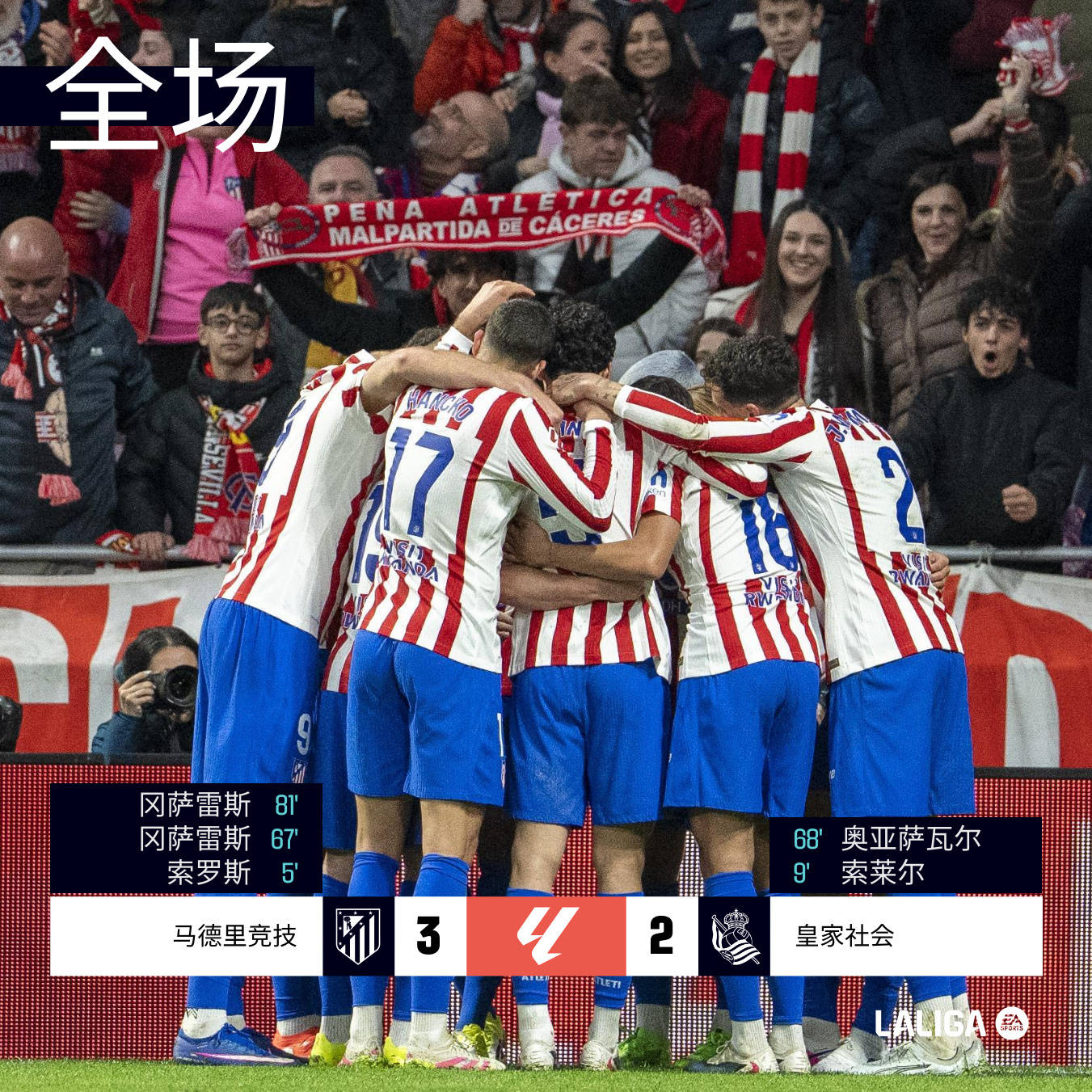 ในการประลองในลาลีกาครั้งนี้ การต่อสู้เป้าหมายได้ถูกจัดฉาก แอตเลติโก มาดริด ถูกตีเสมอสองครั้ง และในที่สุดก็ใช้ส่วนหัวก่อนจบเพื่อคว้าชัยชนะนี้มูลค่าหนึ่งพันดอลลาร์ และรวมเอาความได้เปรียบในรอบคัดเลือกแชมเปี้ยนส์ลีกอย่างสมบูรณ์ สถิติทางเทคนิคโดยรวมนำเสนอการปราบปรามฝ่ายเดียว: แอตเลติโก มาดริด 52 2% ของอัตราการครองบอลควบคุมจังหวะของเกมยิง 24 นัด, 9 นัด, ส่ง 3 แอสซิสต์, และเตะมุม 8 ครั้งเพื่อปราบปรามคู่ต่อสู้อย่างสมบูรณ์ Real Sociedads 47 8% ของอัตราการครองบอลกำลังรอโอกาสที่จะโต้กลับ ผู้ชมมีเพียง 7 นัดและ 3 นัดที่เป้าหมาย แต่คลื่นโลกถูกใช้เพื่อทำให้คะแนนเท่ากันสองครั้งเพื่อให้ความสงสัยของเกมยังคงอยู่จนถึงวินาทีสุดท้าย