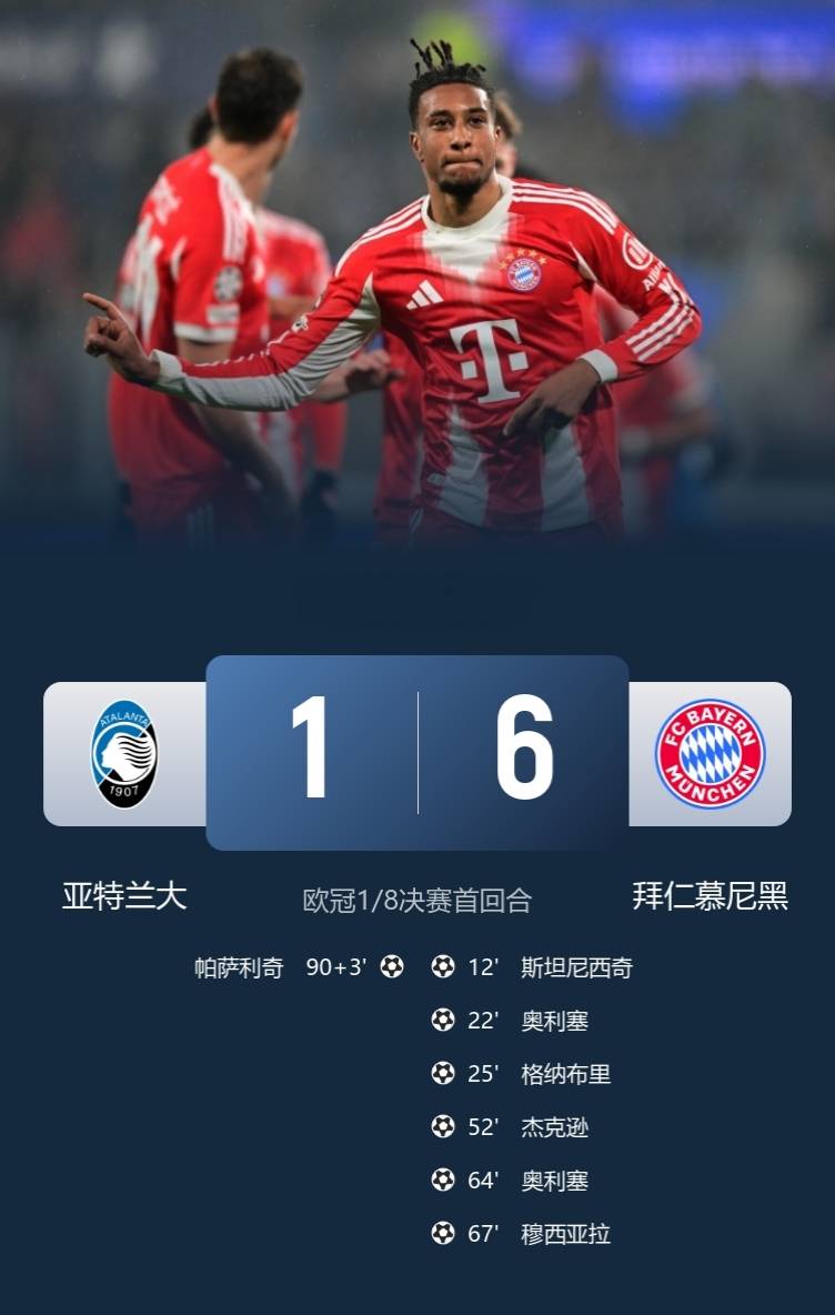 แอตแลนต้า 1-6 บาเยิร์น: ในรอบชิงชนะเลิศแชมเปี้ยนส์ลีก 1/8 รอบชิงชนะเลิศ การแข่งขันกรีฑาสุดท้ายของเซเรีย อา ถูกฉีกออกจากกัน โอลลิส 2 นัดและ 1 ผ่าน แจ็คสันทำ 3 ประตู, แจ็คสันจ่ายบอล, มูเซียยิงประตู, บาเยิร์น ลิโซเอาชนะแอตแลนต้า และชนะ 5 เกมเยือน ราชาใต้เทียบเท่ากับ 8 อันดับแรกของแชมเปี้ยนส์ลีกล่วงหน้า นี่คือสิ่งที่ Kane ชนะโดยไม่มีอาการบาดเจ็บเล็กน้อย เรียกได้ว่าพลังยิงรุกของบาเยิร์นนั้นน่ากลัวมาก