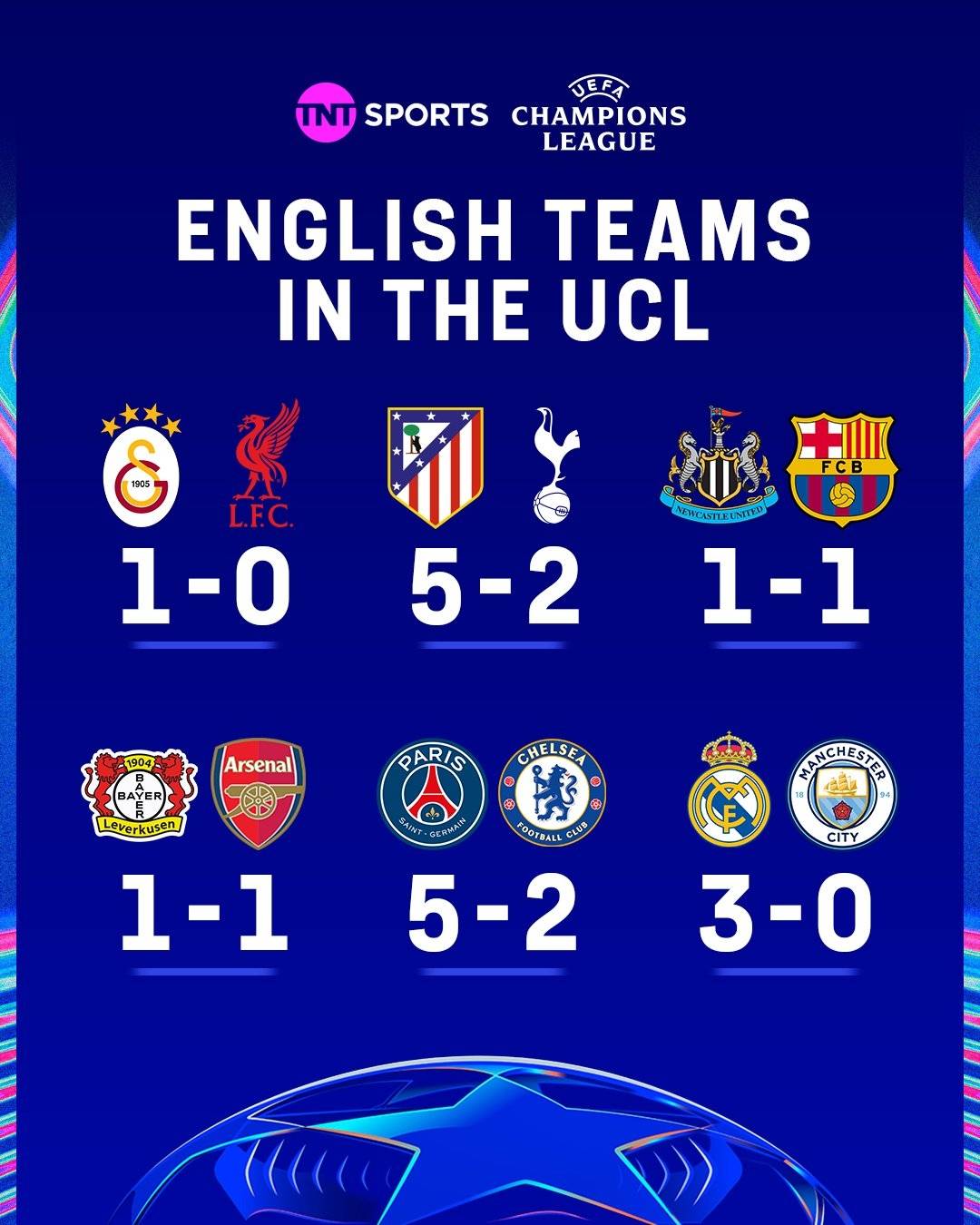 มาพูดถึงทีมพรีเมียร์ลีกที่ 6 ในแชมเปี้ยนส์ลีก: ลิเวอร์พูลแพ้ 0-1 ให้กับกาลาตาซาราย, ท็อตแน่ม แพ้ 2-5 ให้กับแอตเลติโก มาดริด, นิวคาสเซิล 1-1 โดยบาร์เซโลน่าในช่วงทดเวลาหยุด, อาร์เซนอลดึง 1-1 ออกจากเลเวอร์คูเซ่น, เชลซีแพ้ปารีส 2-5 และแมนเชสเตอร์ซิตี้แพ้ 2-5 ไปเยือนเรอัลมาดริด