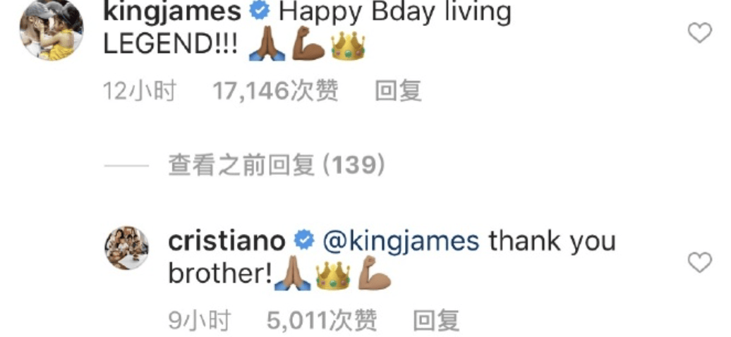 ในเดือนกุมภาพันธ์ 2020 คริสเตียโน โรนัลโด ได้อวยพรวันเกิดให้ตัวเองบนโซเชียลมีเดีย! เลอบรอน เจมส์ ตอบกลับโรนัลโดว่า: "สุขสันต์วันเกิด ตำนานที่มีชีวิต!" โรนัลโดตอบเจมส์ว่า: "ขอบคุณเพื่อน!"