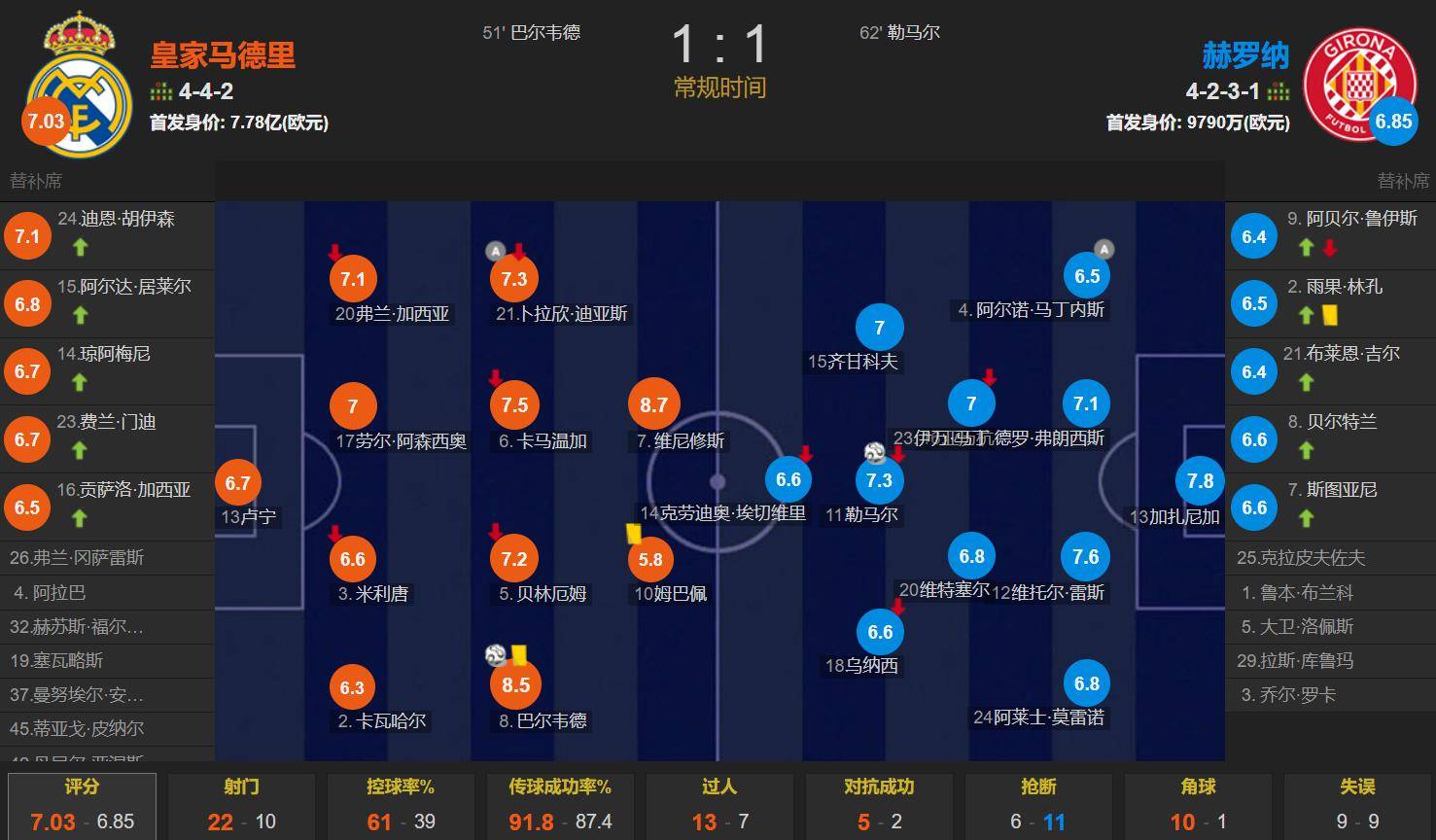 ในแคมเปญนี้ อัตราการครองบอลของเรอัล มาดริดอยู่ที่ 61% และมีทั้งหมด 22 นัด รวม 9 นัดในหรือบน Girona มีทั้งหมด 10 นัด รวมถึง 2 นัดในเป้าหมาย เรอัล มาดริด ไม่สามารถทำแต้มได้ที่เบอร์นาเบว โดยเฉพาะกองหน้า มันไร้พลัง + รักการดำน้ำ Mbappe และ Vinicius ทั้งคู่มี 5 นัด ผลรวมของสองนัดคือผลรวมของจำนวนนัดทั้งหมดของทีม Girona แต่ทั้งสองฝ่ายดึง 1-1 เรอัล มาดริด เสียแต้มใน 2 นัดติดต่อกันของ ลาลีกา และ บาร์เซโลน่า มอบของขวัญชิ้นใหญ่ สถานการณ์ของหวงซาในแชมเปี้ยนส์ลีกไม่ดี เรอัล มาดริด ในรัฐดังกล่าวไปที่สนามกีฬาอลิอันซ์เพื่อต่อสู้กับบาเยิร์น