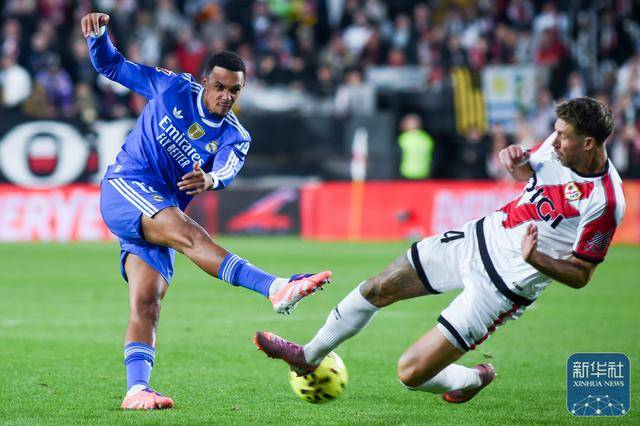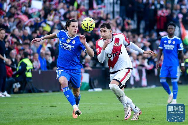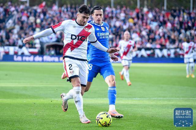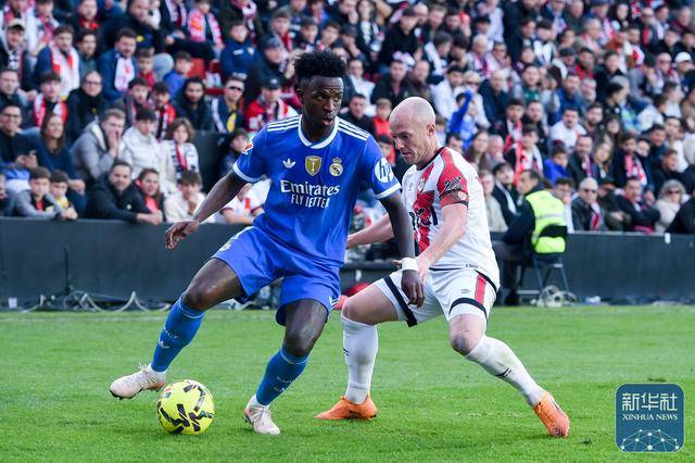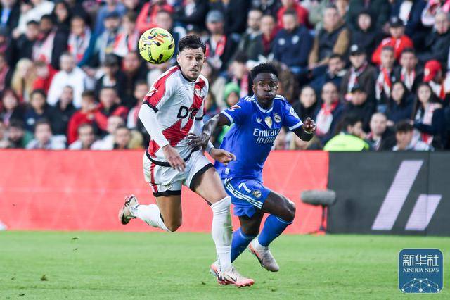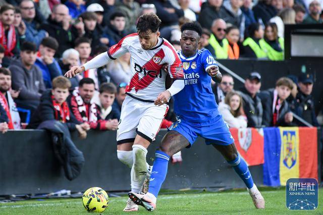 ↑ วินิซิอุสของเรอัล มาดริด (ซ้าย) ต่อสู้เพื่อแย่งบอลกับปาร์ราคอนของราโย บาเยกาโน่ ระหว่างการแข่งขัน