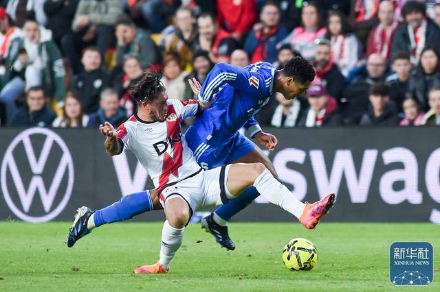 ↑ จู๊ด เบลลิงแฮม ของเรอัล มาดริด (ด้านหลัง) เข้าปะทะกับ ออสการ์ เอสปิโน ของราโย บาเยกาโน่ เพื่อแย่งบอลระหว่างการแข่งขัน