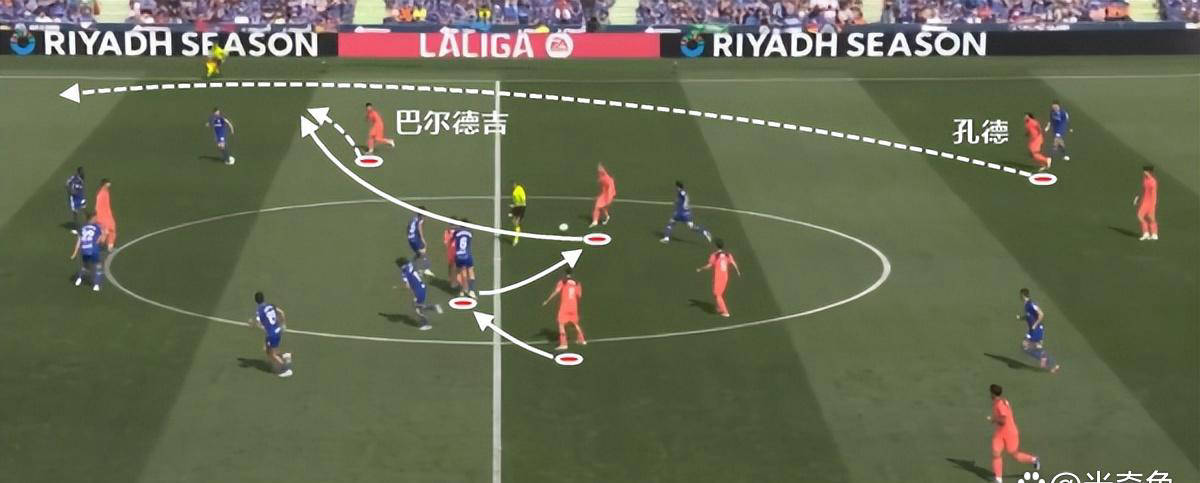 คุณภาพการควบคุมวงกลมกลางของบาร์เซโลนาในยุคฟริคนั้นดีมาก หลังจากรับบอลในช่วงเวลาวิกฤติ ฟูลแบ็คก็เสียบมันเข้าที่ปกติอย่างรวดเร็ว สำหรับ Kongde นี่หมายความว่าเขาต้องวิ่งขึ้นและลงต่อไป โดยมีส่วนร่วมอย่างแข็งขันในการเปลี่ยนแนวรุกและแนวรับ โดยเฉพาะอย่างยิ่งเมื่อเขาร่วมมือกับยามาล ความรับผิดชอบนั้นหนักเป็นพิเศษ ไม่ว่า Yamal จะผ่านได้หรือไม่ Kongde จำเป็นต้องส่งต่อและให้การสนับสนุนอย่างรวดเร็ว ซึ่งทำให้ความต้องการด้านความแข็งแกร่งทางกายภาพและความสามารถในการวิ่งของเขาสูงมาก