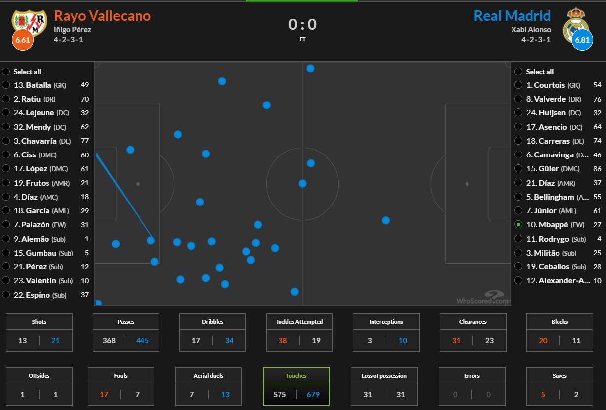 ในสองนัดล่าสุดของเรอัล มาดริด เอ็มบัปเป้ไม่สามารถยิงตรงกรอบได้เลยแม้แต่ครั้งเดียว ขณะที่ทีมเองก็ไม่สามารถทำประตูได้เช่นกัน สิ่งนี้สะท้อนให้เห็นทั้งข้อจำกัดทางแท็คติกของแนวทางของอลอนโซ่ และข้อเท็จจริงที่ว่าตำแหน่งการเล่นของเอ็มบัปเป้ในแดนหน้าตรงกลางได้จำกัดความสามารถของทีมในการดำเนินแผนการเล่นเชิงแท็คติกที่ซับซ้อนมากขึ้น
