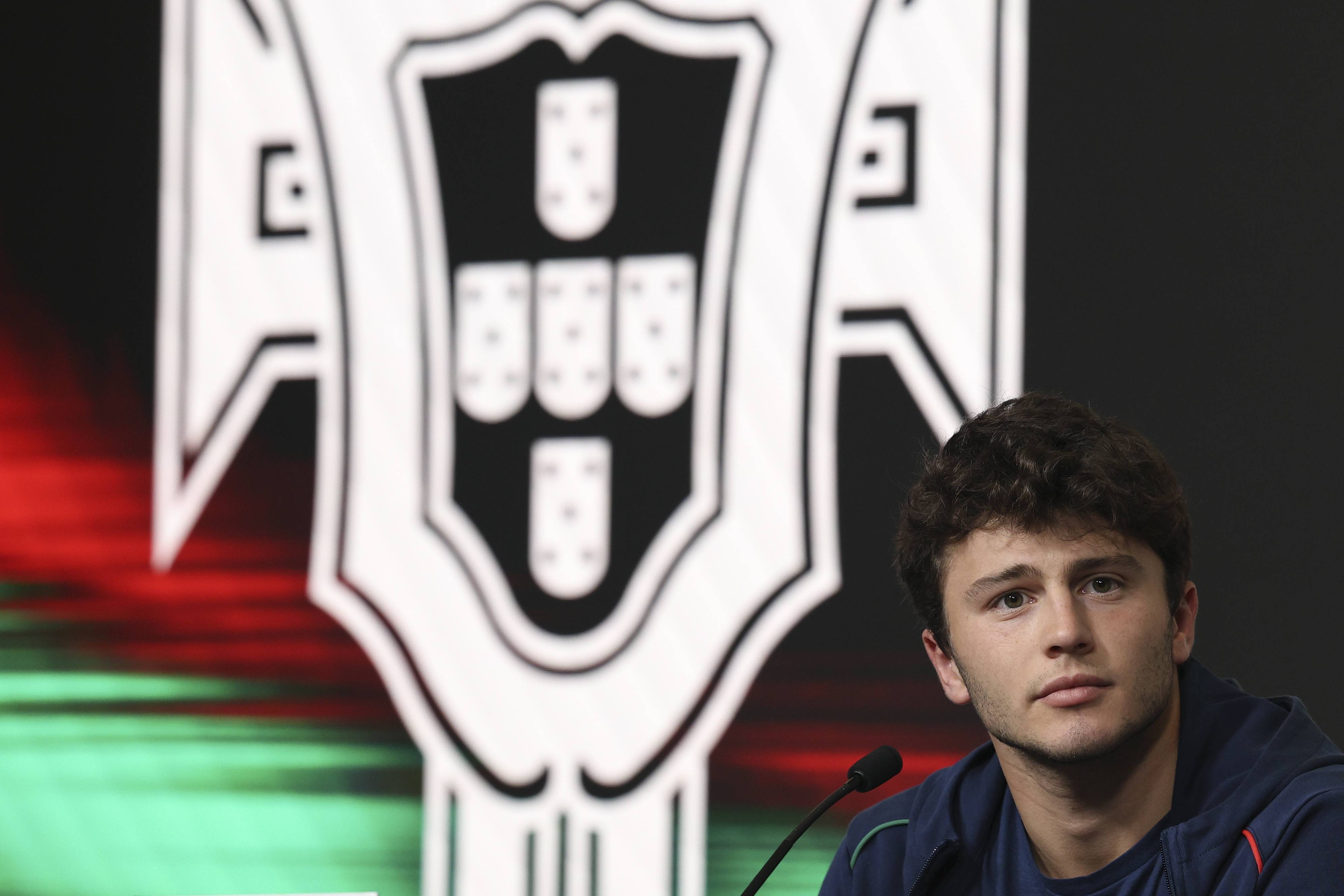 เมื่อวันที่ 10 พฤศจิกายน นักฟุตบอลทีมชาติโปรตุเกส João Neves เข้าร่วมงานแถลงข่าว Xinhua/EFE