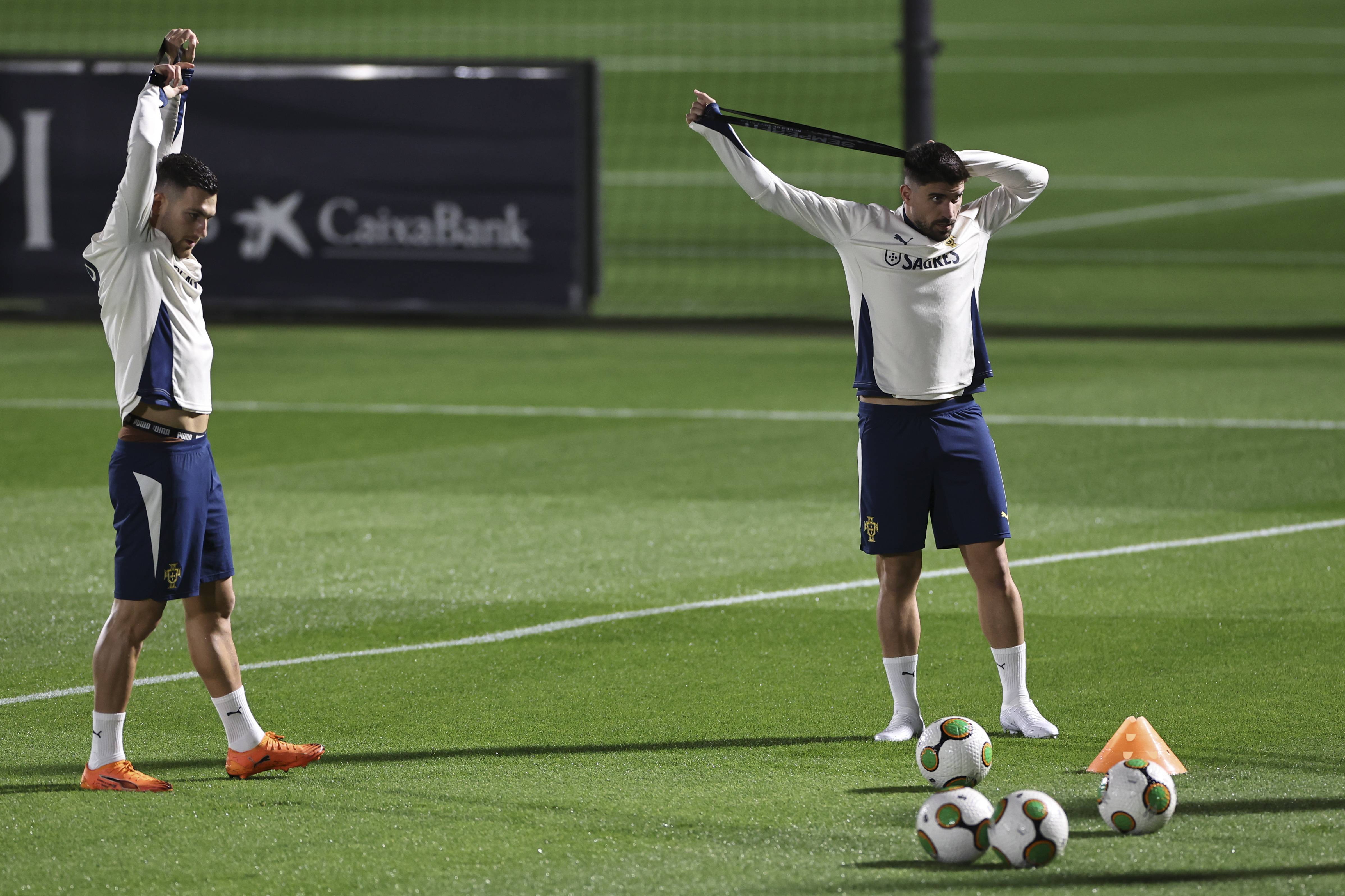 เมื่อวันที่ 10 พฤศจิกายน นักเตะทีมชาติโปรตุเกส รูเบน เนเวส (ขวา) และดิโอโก ดาโลต์ ระหว่างการฝึกซ้อม ซินหัว/EPA