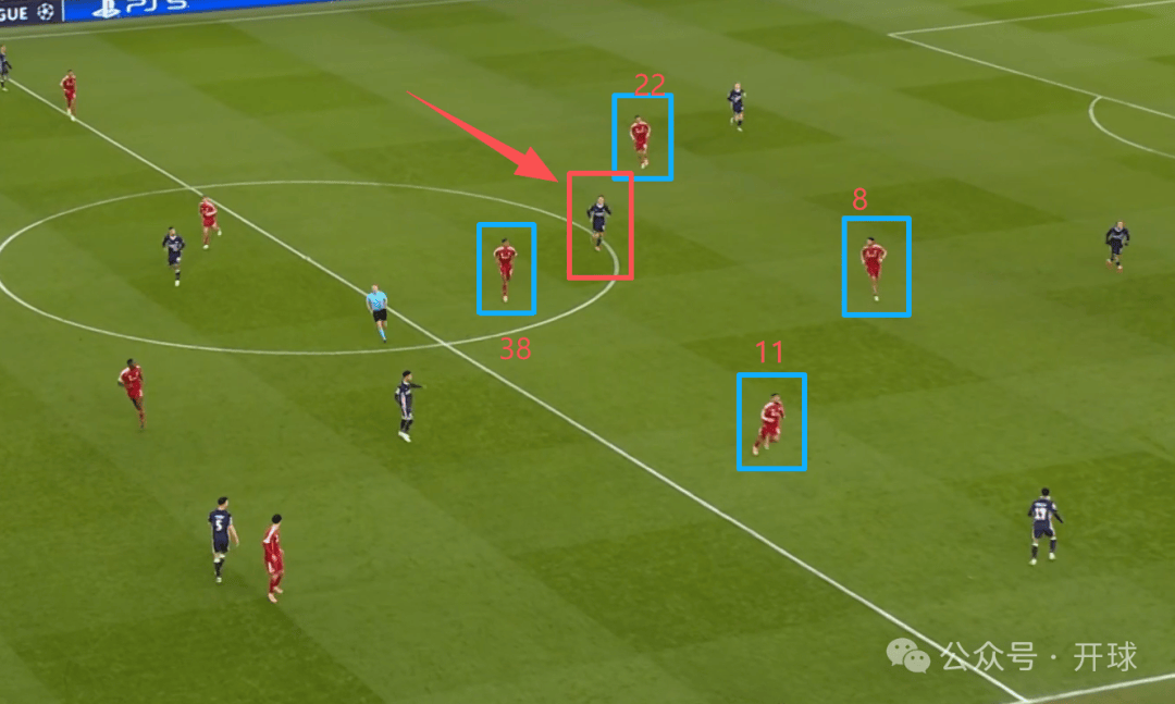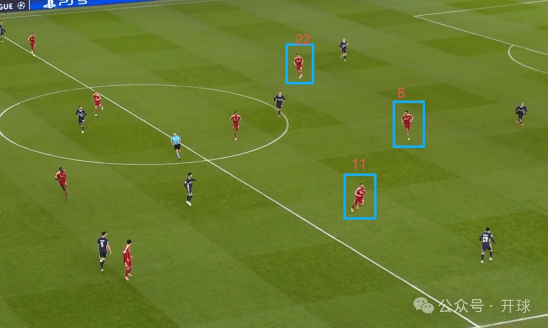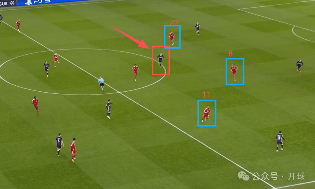 จากแผนภาพจะเห็นได้ว่าตำแหน่งของโซโบสลัยนั้นลึกเกินไปอย่างเห็นได้ชัด เพื่อสนับสนุนการกดดันสูงของกองหน้าตัวเป้าอย่างเอกิติ เขาไม่เพียงแต่ต้องรับภาระหน้าที่ในการเล่นเกมรับบางส่วนที่ปกติแล้วเป็นหน้าที่ของกองหน้าตัวเป้าเท่านั้น แต่ยังต้องรับมือกับแรงกดดันเพิ่มเติมจากซาลาห์ที่กดดันเข้ามาเป็นครั้งคราวอีกด้วย หากโซโบสลัยดันสูงเกินไป ผู้เล่นฝ่ายตรงข้ามที่ไม่มีตัวประกบจะปรากฏตัวอยู่ด้านหลังเขา ดังที่แสดงให้เห็นโดยผู้เล่นที่ระบุในกรอบสีแดงในภาพด้านล่าง