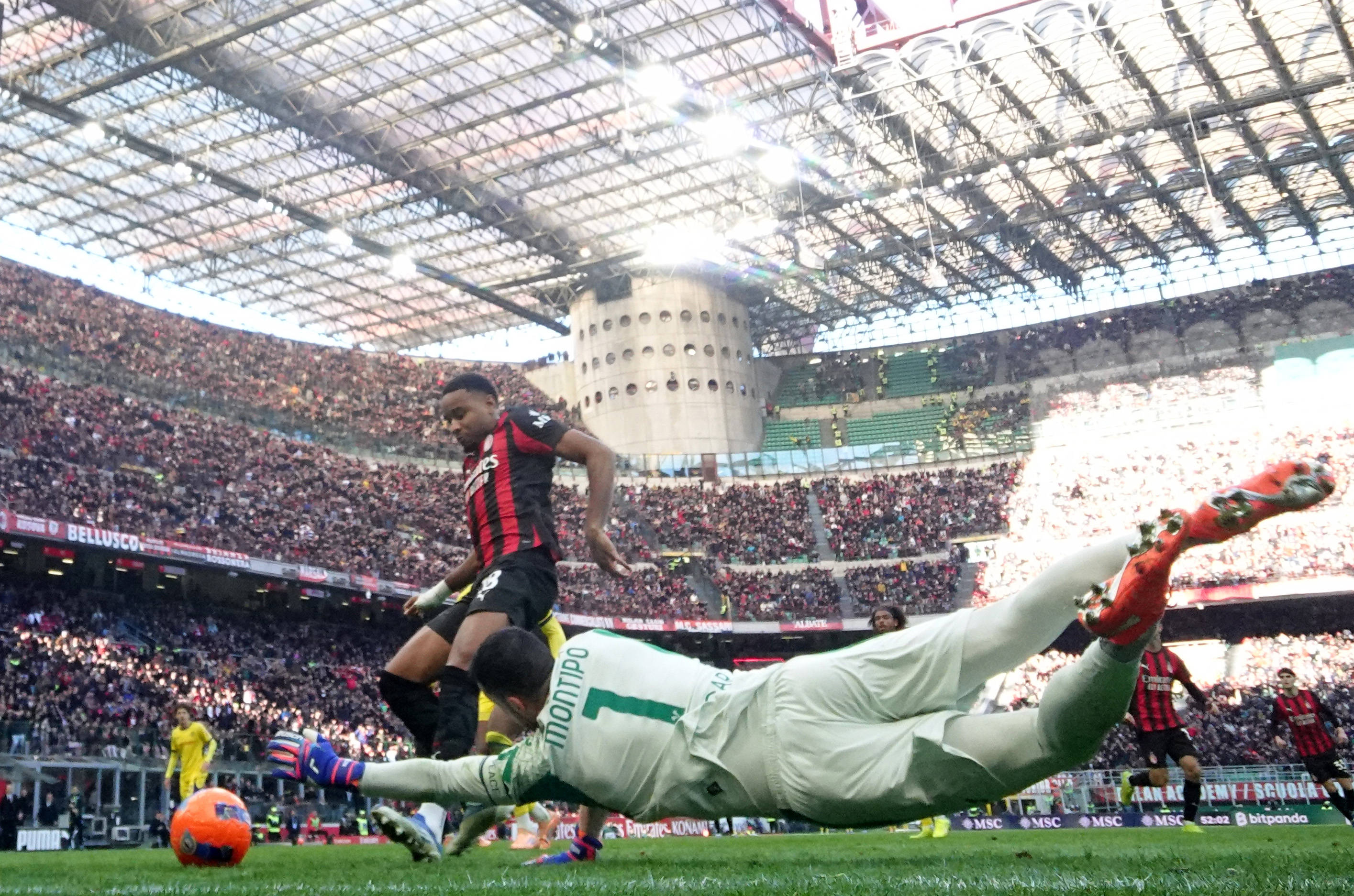 เมื่อวันที่ 28 ธันวาคม คริสโตเฟอร์ เอ็นคุนคู นักเตะของเอซี มิลาน (ด้านหน้า) ยิงจุดโทษเข้าประตูระหว่างการแข่งขัน สำนักข่าวซินหัว (ภาพโดย อัลแบร์โต ลิงเลีย)