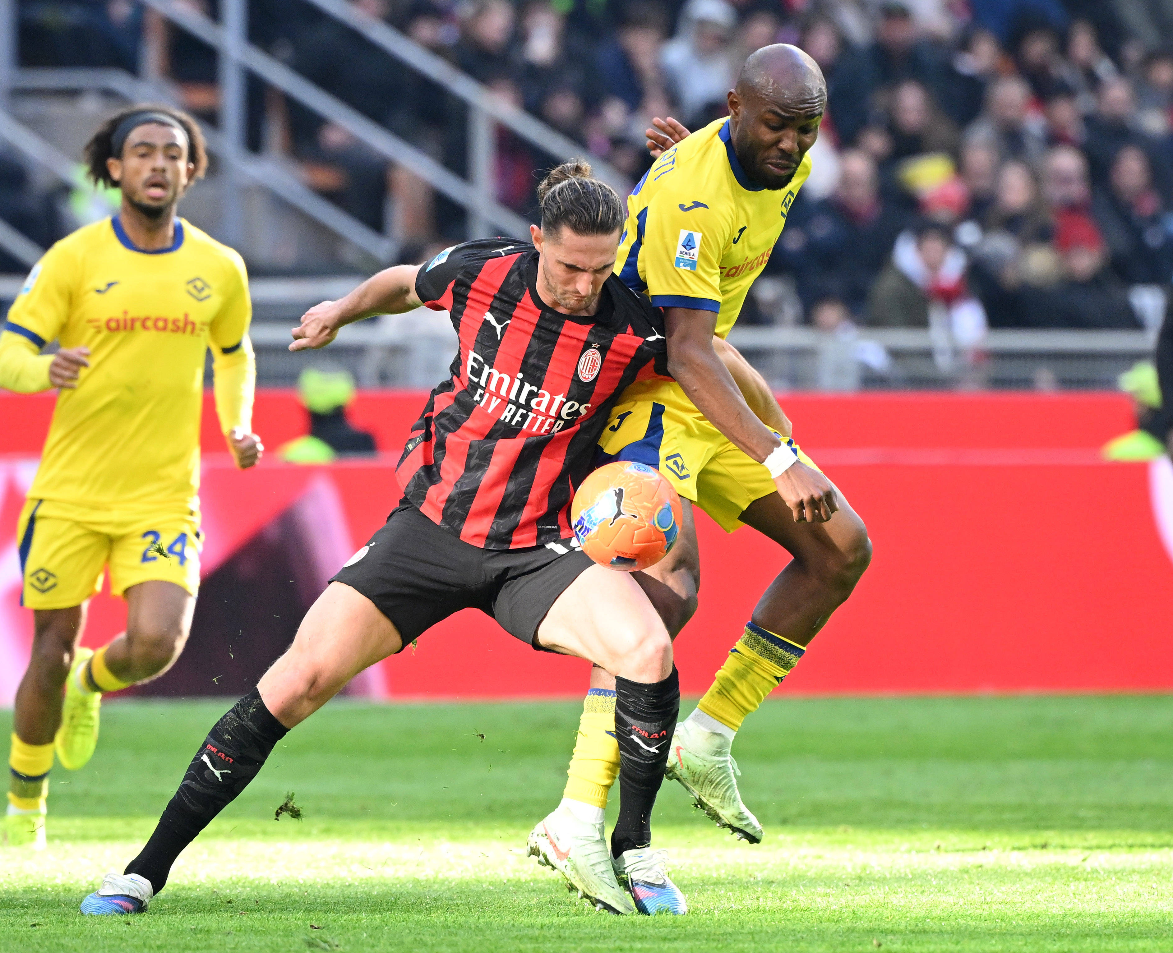 เมื่อวันที่ 28 ธันวาคม คริสเตียน พูลิซิช ของเอซี มิลาน (ขวา) ท้าทาย นิอาสเซ ของเฮลลาส เวโรนา ระหว่างการแข่งขัน สำนักข่าวซินหัว (ภาพโดย อัลแบร์โต ลิงเกีย)