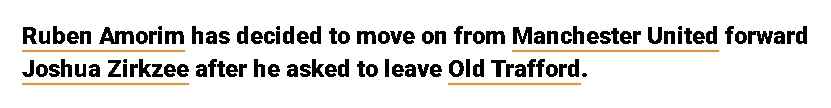 สื่ออังกฤษยืนยันว่าผู้จัดการทีมแมนเชสเตอร์ ยูไนเต็ด รูเบน อาโมริม พร้อมที่จะปล่อยตัวกองหน้าตัวกลาง โจชัว ซิร์กซี ออกจากทีมในปีหน้า หลังจากที่สโมสรได้ซื้อตัวซิร์กซีมาจากโบโลญญา ทีมในเซเรีย อา ด้วยค่าตัว 42.5 ล้านยูโร (36.5 ล้านปอนด์) ในช่วงตลาดซื้อขายนักเตะฤดูร้อนปี 2024 สโมสรต้องการที่จะได้รับเงินคืนส่วนใหญ่จากการลงทุนนี้เมื่อเขาถูกขายออกไป
