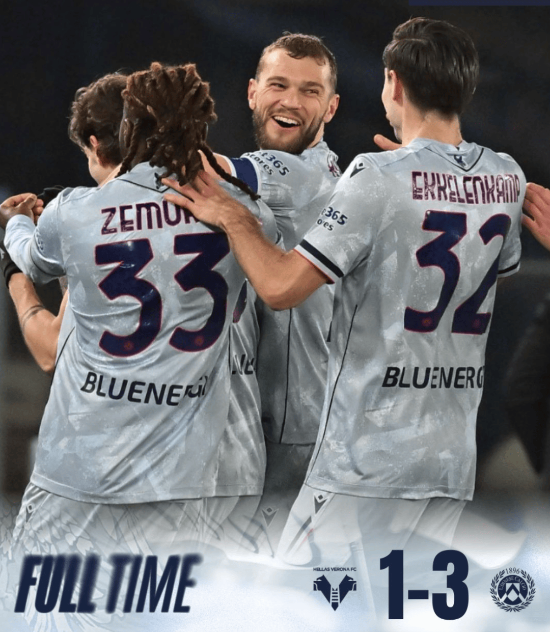 อูดิเนเซ่ยุติสถิติไร้ชัยสองนัดติดต่อกันด้วยชัยชนะ 3-1 ในเกมเยือนเหนือเวโรนา ทีมบ๊วยของตาราง ในศึกเซเรียอา นัดล่าสุด โดยในเกมนี้ พิโอโทรวสกีต้องพักเนื่องจากอาการบาดเจ็บ ทำให้เบร์โตลา, เซมมูลา และมิลเลอร์ได้ลงตัวจริงในครึ่งแรก อัทต้าทำให้อูดิเนเซ่ขึ้นนำ แต่แล้วออร์บานี ผู้ทำประตูสูงสุดของเวโรนา ก็ทำประตูตีเสมอได้ หลังจากที่โจวานนีออกจากสนามไป กองหน้าชาวไนจีเรียก็พบว่าตัวเองถูกทิ้งให้อยู่หน้าคนเดียวในครึ่งหลัง ซาโนลีทำประตูแรกของเขาตั้งแต่เข้าร่วมทีม ขณะที่เดวิสทำประตูที่เจ็ดของเขาในฤดูกาลนี้ ชัยชนะครั้งนี้ทำให้อูดิเนเซ่ขึ้นมาอยู่อันดับที่สิบเอ็ด ห่างจากฟิออเรนติน่าที่อยู่อันดับสามจากท้ายตารางสิบสองคะแนน และห่างจากโคโมที่อยู่อันดับหกสิบสองคะแนนผู้จัดการทีมอูดิเนเซ่ คอสตา รุนยาอิค ให้สัมภาษณ์หลังจบการแข่งขันว่า ฟอร์มของทีมขาดความสม่ำเสมอ โดยระบุว่านอกเหนือจากช่วงต้นฤดูกาลที่ทีมสามารถเก็บชัยชนะติดต่อกันได้ ทีมก็ไม่สามารถคว้าชัยชนะติดต่อกันได้ใน 5 ครั้งต่อมา อย่างไรก็ตาม ชัยชนะครั้งนี้มาพร้อมกับราคาที่ต้องจ่ายอย่างหนัก เมื่อซาโน่ ผู้เล่นที่ยืมตัวมาจากนาโปลี ได้รับบาดเจ็บที่หัวเข่าจนต้องพักรักษาตัวตลอดฤดูกาล