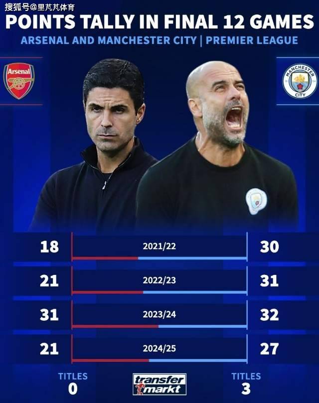 ข้อมูลระบุว่า อาร์เซนอลสามารถเก็บคะแนนได้เกิน 30 คะแนนใน 12 นัดสุดท้ายของฤดูกาลเพียงครั้งเดียวเท่านั้น ขณะที่แมนเชสเตอร์ ซิตี้สามารถรักษาค่าเฉลี่ยคะแนนต่อเกมให้เกิน 27 คะแนนได้ในระยะสุดท้ายของทุกฤดูกาล