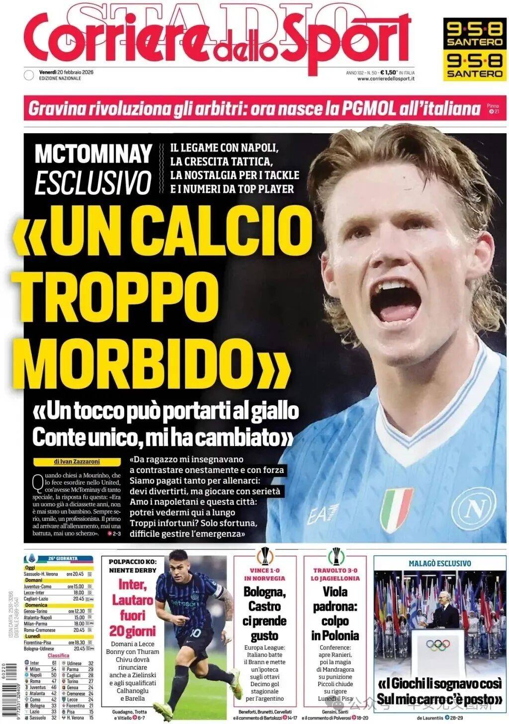 1. สัมภาษณ์พิเศษของแม็คโทมิเนย์: "ฟุตบอลกลายเป็นเกมที่นุ่มนวลเกินไป" ความเชื่อมโยงกับนาโปลี การเติบโตทางแท็คติก ความคิดถึงการเล่นแบบเข้าปะทะ และสถิติที่คู่ควรกับนักเตะระดับท็อป "คุณอาจโดนใบเหลืองได้จากการสัมผัสบอลเพียงครั้งเดียว คอนเต้เป็นโค้ชที่แตกต่างจากคนอื่น เขาเปลี่ยนแปลงผมไปเลย ตอนเป็นเด็ก ผมถูกสอนให้เข้าปะทะอย่างถูกต้อง แต่ต้องใช้พลัง"เราทุ่มเทอย่างหนักในการฝึกซ้อม: คุณต้องสนุกกับการเล่นในขณะที่จริงจังกับมัน ผมรักนาโปลีและเมืองนี้มาก ผมสามารถมองเห็นตัวเองอยู่ที่นี่ได้อีกนาน อาการบาดเจ็บมากเกินไปหรือเปล่า? แค่โชคร้ายเท่านั้น – สถานการณ์ฉุกเฉินที่ยากจะจัดการ