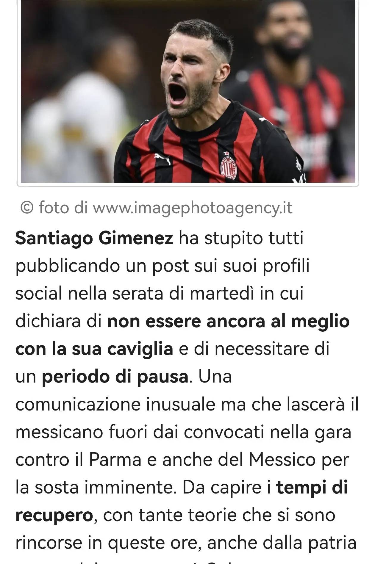 นักข่าวชื่อดังแห่งเซเรียอา: ฆิเมเนซประกาศการถูกพักงานในลักษณะที่ไม่ปกติ คาดว่าจะต้องพักรักษาตัวเป็นเวลาสองถึงสามสัปดาห์เนื่องจากอาการบาดเจ็บ ระยะเวลาการฟื้นตัว: ข้อเท้า