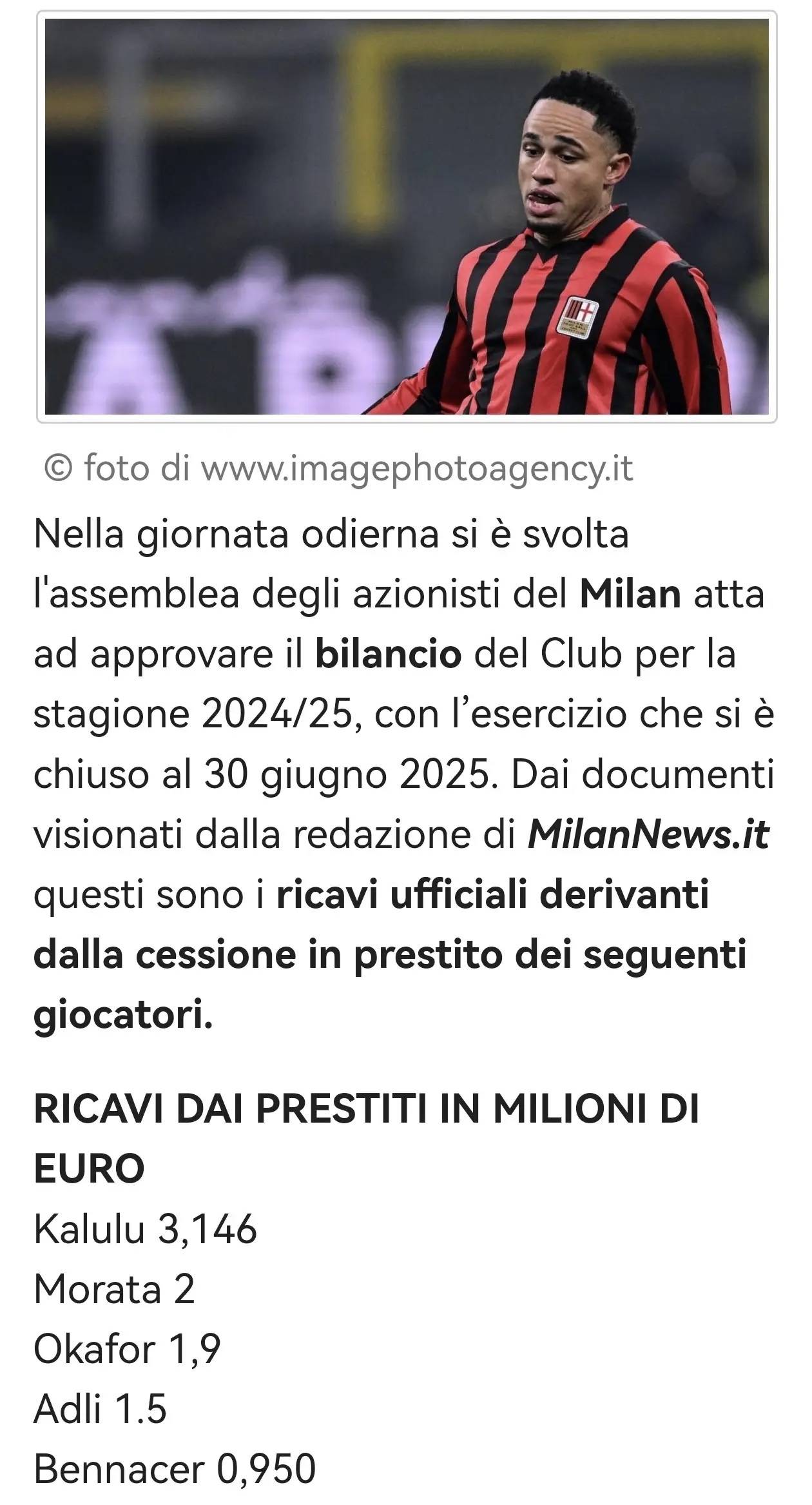 วันนี้ เอซี มิลาน ได้จัดการประชุมผู้ถือหุ้นเพื่ออนุมัติงบการเงินของสโมสรสำหรับฤดูกาล 2024/25 (สิ้นสุดวันที่ 30 มิถุนายน 2025) ตามเอกสารที่ Milan News Network ได้ตรวจสอบ ข้อตกลงการยืมตัวของนักเตะต่อไปนี้ได้สร้างรายได้อย่างเป็นทางการให้กับสโมสร โดยมีรายละเอียดดังนี้: