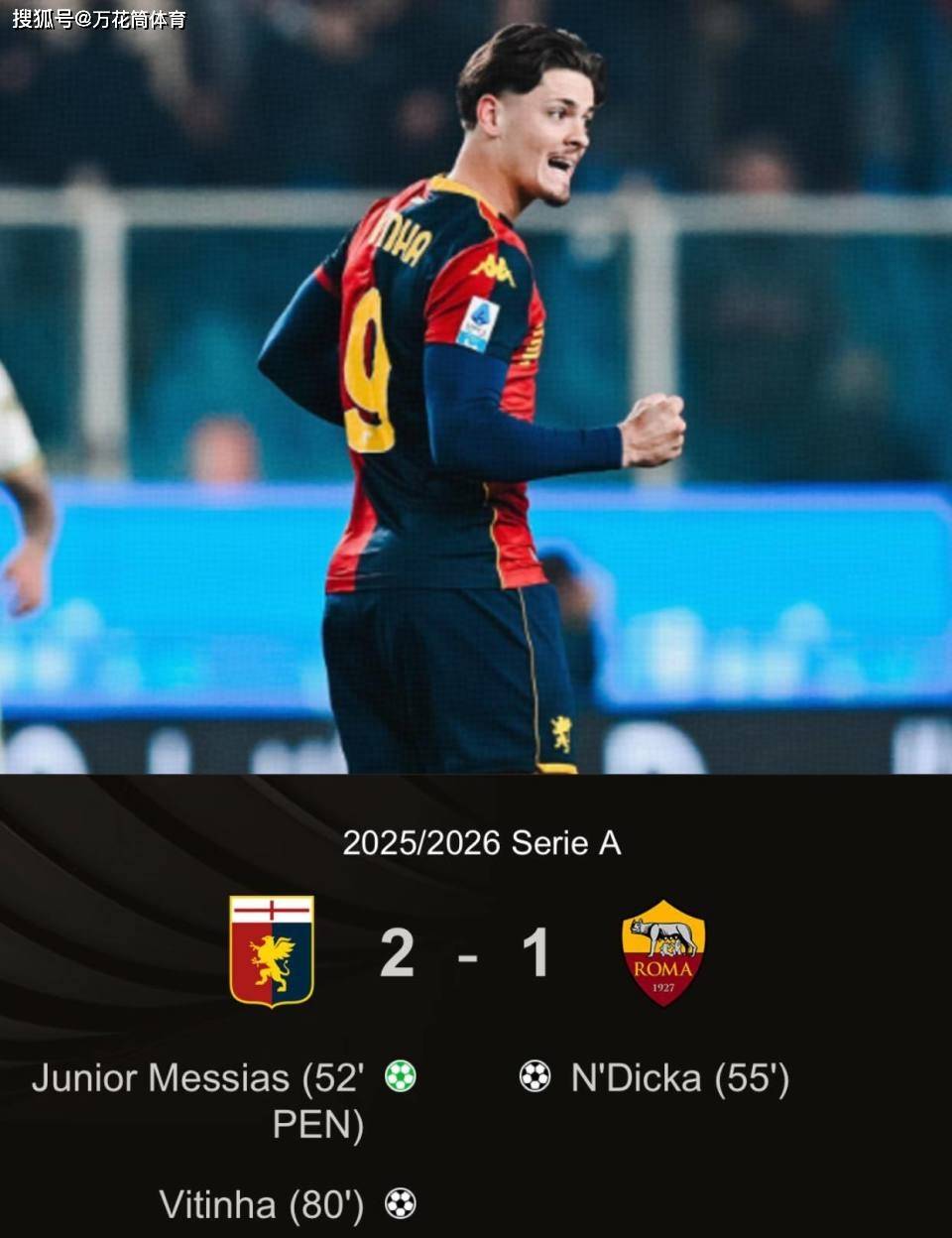 เจนัวที่รอดพ้นจากภัยพิบัติ เสร็จสิ้นการระเบิดที่ร้ายแรงเมื่อสิ้นสุดเกม ในนาทีที่ 81 วิทิเนียตกแต่งด้วยพลั่วยิงหน้าประตู และโรมก็ตามหลัง 1-2 อีกครั้ง จากนั้นโค้ช Gasperini ได้สั่งการสาวกอย่างเมามัน พยายามทำให้คะแนนเท่ากัน แต่เหลือเวลาไม่มาก ในท้ายที่สุด คะแนนได้รับการแก้ไขที่ 2-1 และเจนัวก็ออกมาไม่เป็นที่นิยมอย่างมาก