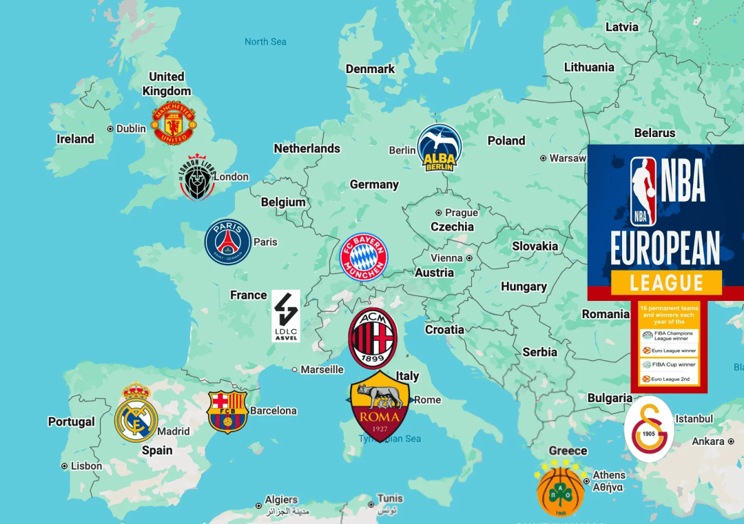 เช่นเดียวกับรุ่นฟุตบอลของ "ยุโรปซูเปอร์ลีก" และการแข่งขันแชมเปี้ยนส์ลีกสำหรับยักษ์ใหญ่รุ่นบาสเก็ตบอลของ NBA Europa League "European Super" ขึ้นอยู่กับลีกบาสเกตบอลยุโรป (Eurleague) ของบาสเก็ตบอลรุ่นแชมเปี้ยนส์ลีก เอ็นบีเอ ยูโรปา ลีก ให้ความสำคัญกับยักษ์ใหญ่ของฟุตบอลยุโรปเข้าร่วม และด้วยความช่วยเหลือจากความนิยมและมูลค่าทางการค้าของยักษ์ใหญ่ฟุตบอลยุโรป เราต้องยืนบนไหล่ของ "ยักษ์ใหญ่ด้านฟุตบอล" ตั้งแต่เริ่มต้น