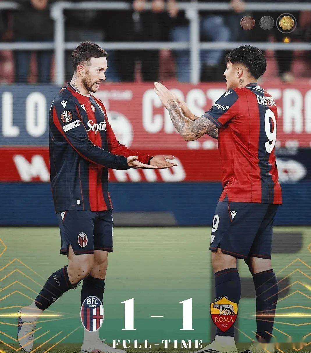 หลังอีควอไลเซอร์โรมมีโอกาสแซง ในนาทีที่ 76 มาเรนได้โอกาสอีกครั้ง และเขาตีอีกข้างหนึ่งและโผล่ออกมาหลังจากยิงในเขตโทษหักเห ในนาทีสุดท้ายของเกม Bologna ยังมีโอกาสรู้เรื่อง ในนาทีที่ 89 Vetik ได้รับลูกตั้งเตะและมุ่งหน้าไปที่เป้าหมาย และลูกบอลก็โดนคานประตูและโผล่ออกมา ในที่สุดสองฝ่ายก็จับมือ 1-1 ทำสันติสุข การจับฉลากครั้งนี้ทำให้โบโลญญาสามารถขยายสถิติไร้พ่ายของยุโรปเป็น 10 เกม ซึ่งเป็นการสร้างสถิติใหม่สำหรับประวัติศาสตร์ของทีม และเปเยลกรินี่ยิงได้ 60 ประตูให้กับโรมตั้งแต่ฤดูกาล 2017-18 และมีเพียง Calhanoglu และ Pasalich เท่านั้นที่ทำประตูได้มากกว่าเขาในกองกลาง Serie A ในช่วงเวลาเดียวกัน