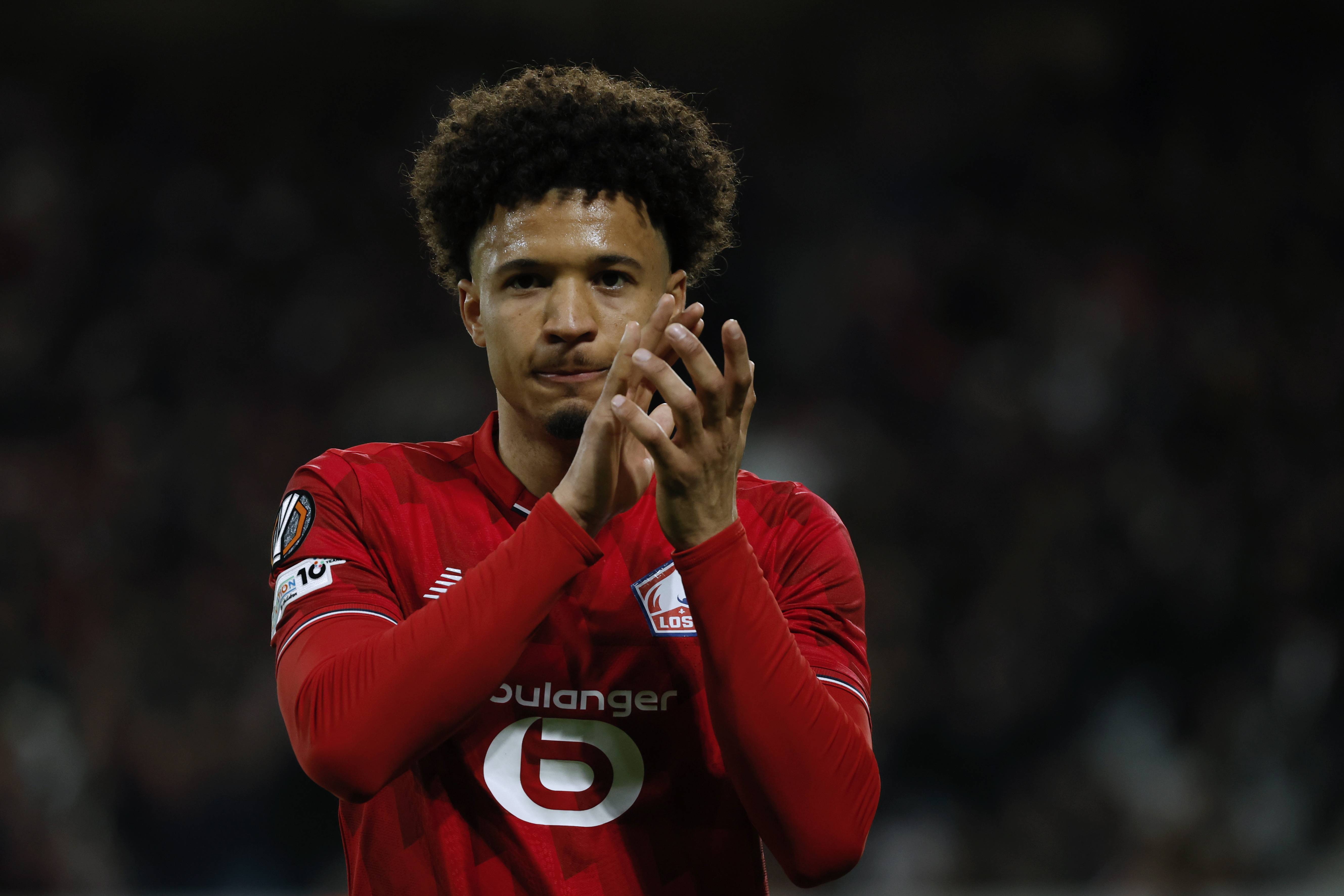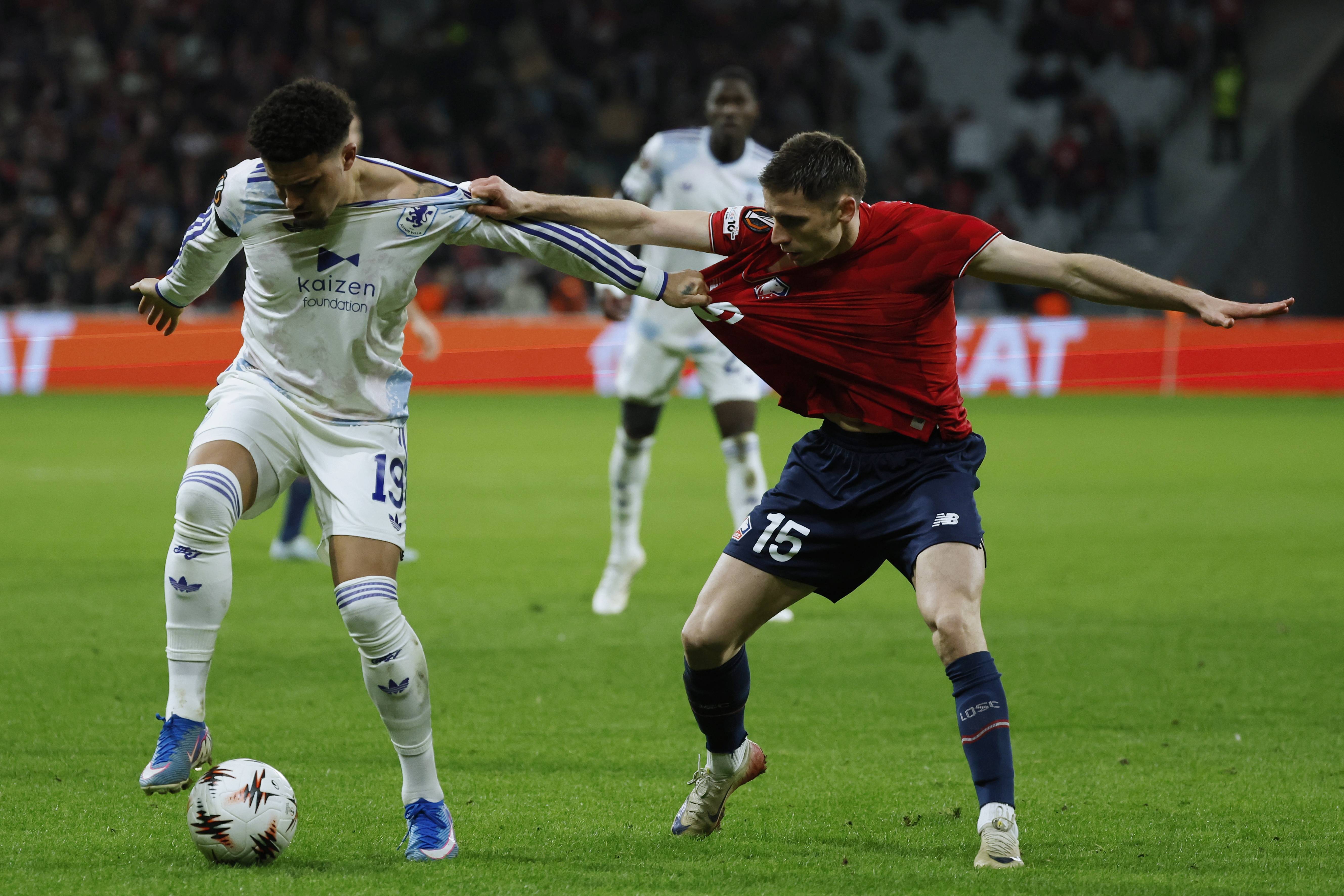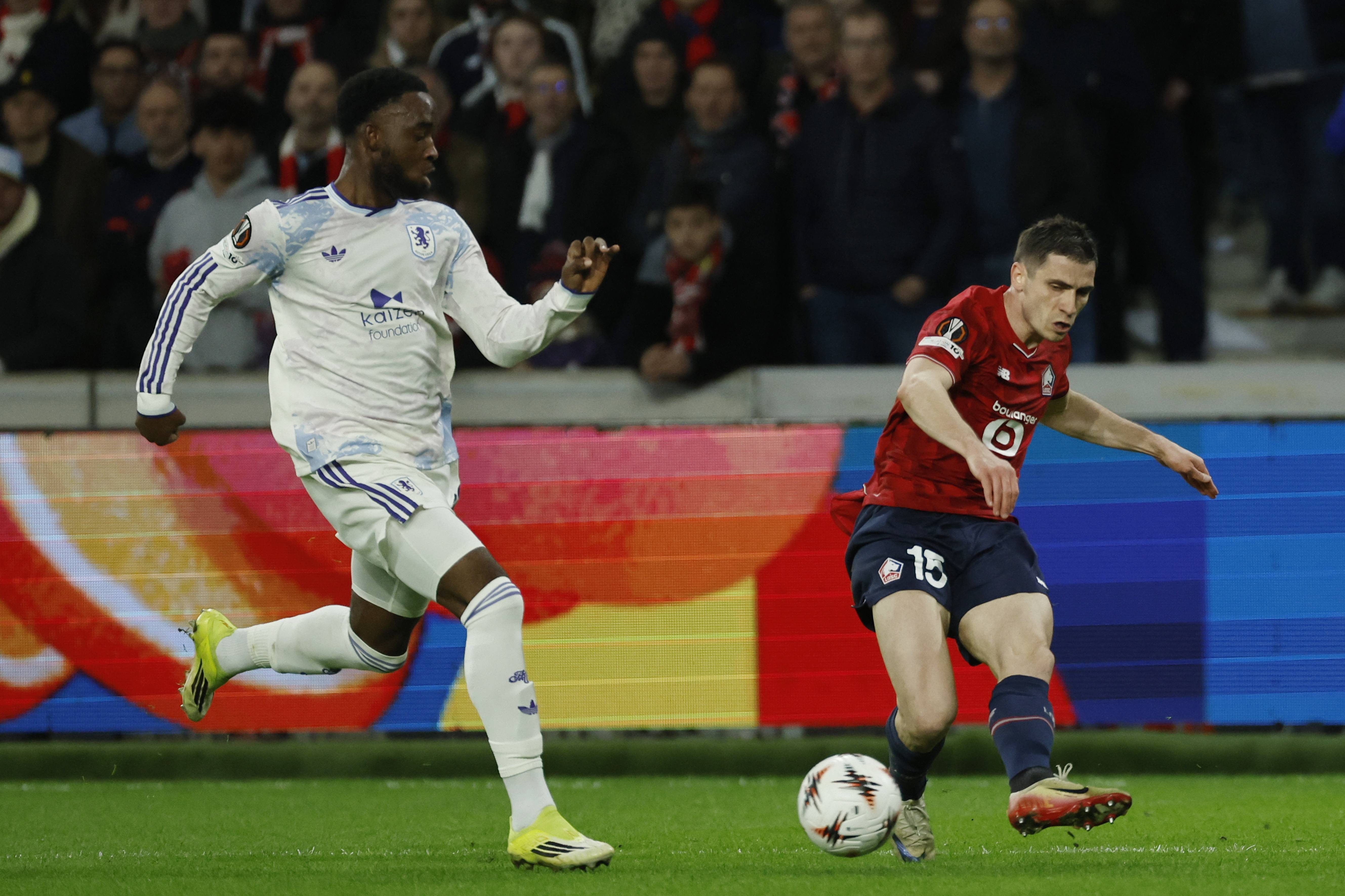 ผู้เล่น Aston Villa Sancho (ซ้าย) เมื่อวันที่ 12 มีนาคม ต่อสู้กับผู้เล่น Lille Pero สำนักข่าวซินหัว/OU XIN