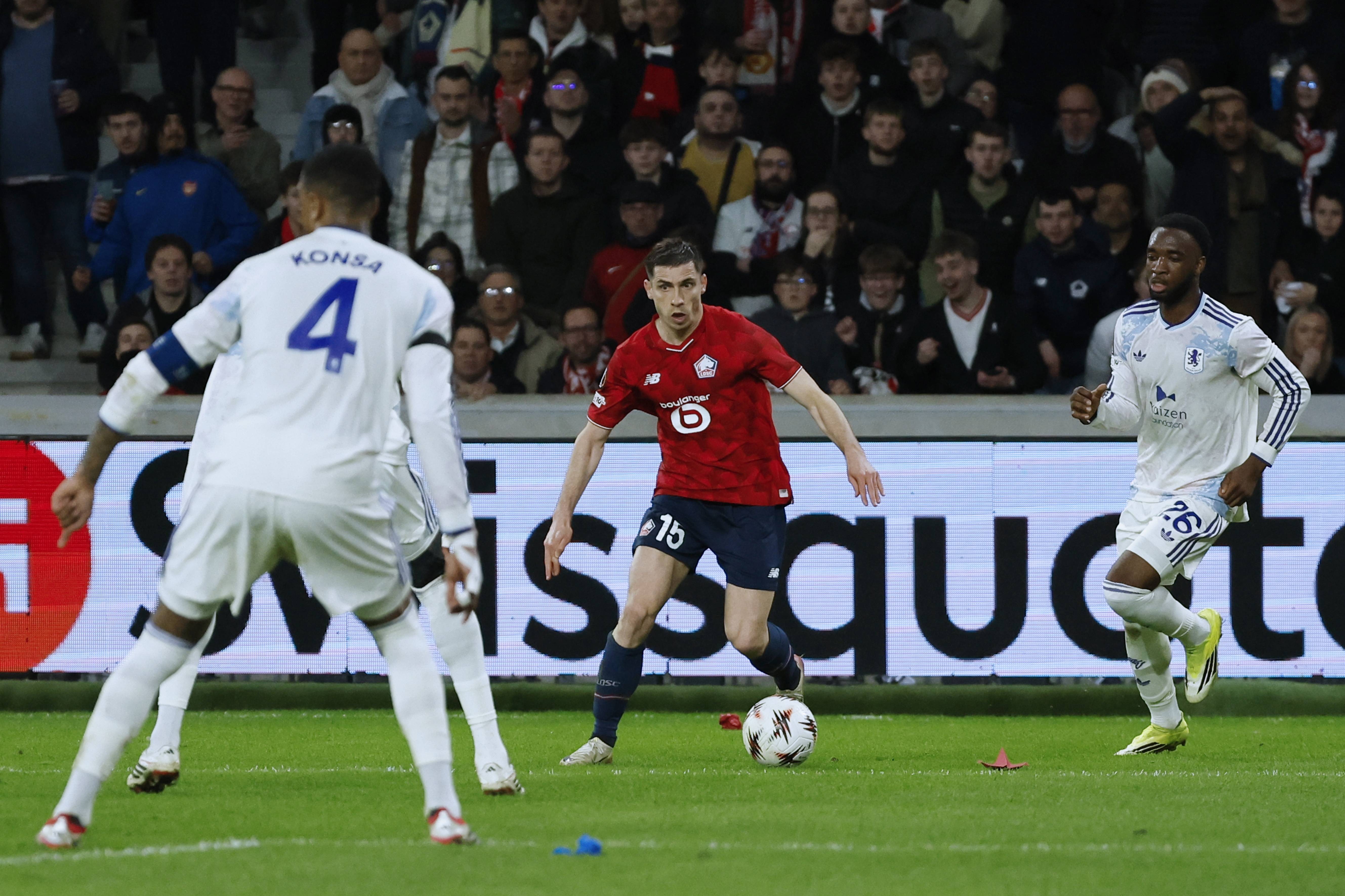 ผู้เล่น Aston Villa Bogard (ซ้าย) เมื่อวันที่ 12 มีนาคม ต่อสู้กับผู้เล่น Lille Pero สำนักข่าวซินหัว/OU XIN
