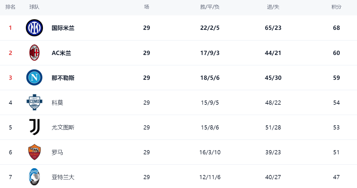 ในอันดับ อินเตอร์ มิลาน คว้าตำแหน่งสูงสุดด้วยคะแนน 68 แต้ม ด้วยสถิติชนะ 22 ครั้ง เสมอ 2 แพ้ 5 อินเตอร์ มิลาน รอบนี้ เสมอ แอตแลนต้า เดิมทีมันเป็นโอกาสที่ดีสำหรับเอซี มิลานที่จะไล่ตามคะแนนตามหลังเขา โดยไม่คาดคิด เอซี มิลาน หลุดพ้นจากการตกต่ำ ส่งผลให้อินเตอร์ มิลานมีช่องว่างมากขึ้น เอซี มิลาน 60 แต้ม ตามหลัง 8 แต้ม! นาโปลีเป็นที่ 3 ด้วยคะแนน 59 คะแนน Cesc Fabregas นำม้ามืดตัวใหญ่ของ Como เอาชนะ Roma และเข้าสู่ Champions League ในอันดับที่ 4 ยูเวนตุส 53 แต้ม ตกไปอยู่อันดับที่ 5 โรม่าถูกทิ้งไว้ข้างหลัง อันดับที่ 6 ด้วยคะแนน 51 คะแนน