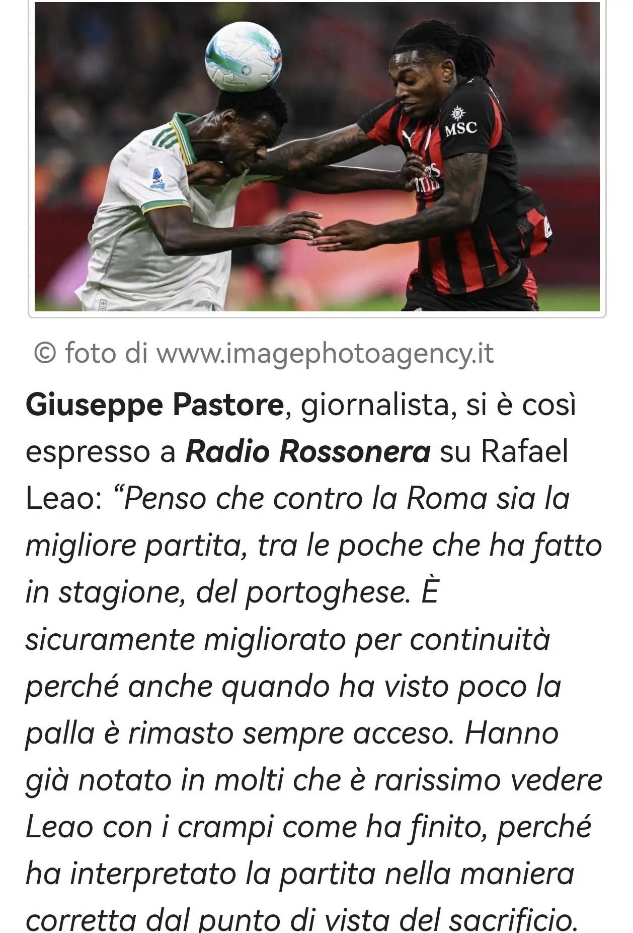 นักข่าว Giuseppe Pastore แสดงความคิดเห็นเกี่ยวกับ Rafael Leão ระหว่างการถ่ายทอดสดของ Rossoneri Radio: "ผมเชื่อว่าแมตช์ที่เจอกับ Roma ถือเป็นหนึ่งในผลงานที่ดีที่สุดของนักเตะชาวโปรตุเกสคนนี้ในฤดูกาลนี้ ความสม่ำเสมอของเขาได้พัฒนาขึ้นอย่างไม่ต้องสงสัย - ยังคงมีสมาธิตลอดแม้จะมีโอกาสสัมผัสบอลน้อยก็ตามหลายคนได้สังเกตว่ามันเป็นเรื่องหายากที่เขาจะจบการแข่งขันด้วยอาการตะคริว และเขาได้เข้าหาเกมนี้ด้วยทัศนคติที่ถูกต้อง แสดงให้เห็นถึงความมุ่งมั่นที่ไม่เห็นแก่ตัวตลอดการแข่งขัน