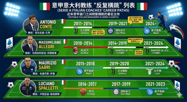 อัลเลกรีออกจากยูเวนตุสและกลับมาอีกไม่กี่ปีต่อมาคอนเต้ไปอินเตอร์มิลานหลังจากยูเวนตุสประสบความสำเร็จและกลับมาที่อิตาลีเพื่อสอนเนเปิลส์ในอีกไม่กี่ปีต่อมา Inzaghi กระโดดจากลาซิโอไปยังอินเตอร์มิลาน Piol กระโดดข้ามไปมาระหว่างคลับเหล่านี้ซ้ำแล้วซ้ำเล่า ... คุณยังสามารถวาดภาพและเชื่อมต่อประวัติย่อของหัวหน้าโค้ชกัลโช่ในเซเรียอา และคุณจะพบว่านี่เป็นวงปิดที่น่าตื่นตาตื่นใจ