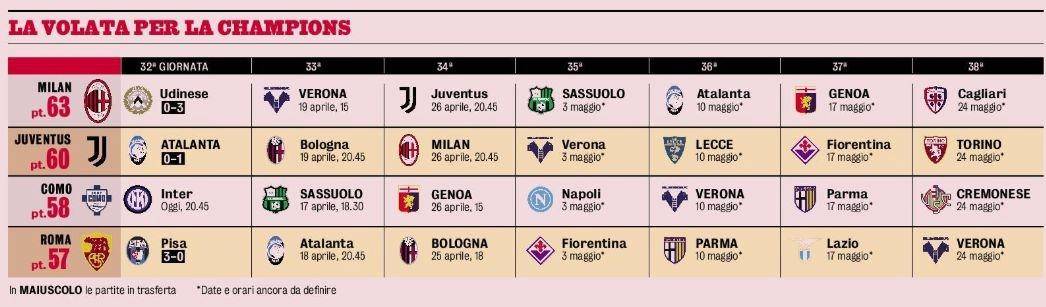 เป็นมูลค่าการกล่าวขวัญว่าหลังจากมิลานแพ้ให้กับ Udinese แม้ว่าจะยังคงมีความแตกต่าง 5 แต้มกับ Como อันดับที่ห้า แต่สถานการณ์ของการแข่งขันทั้งสี่ได้กลายเป็นเรื่องรุนแรงภายใต้สถานการณ์ที่ปัญหาของแนวหน้านั้นล้นหลาม เหลืออีก 6 รอบในลีก ปัจจุบันอินเตอร์มิลานและเนเปิลส์ค่อนข้างปลอดภัย มิลาน ยูเวนตุส โคโม่ และโรม จำเป็นต้องแข่งขันกันเพื่อชิงตำแหน่งที่เหลืออีก 2 แห่ง