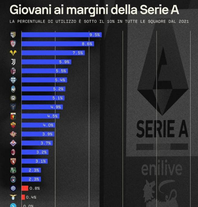 นอกจากนี้ยังมีตัวเลขที่น่าตกใจ: ในช่วงไม่กี่ปีที่ผ่านมาไม่มีทีมใดในเซเรียอาที่อนุญาตให้ผู้เล่น U21 เล่นมากกว่า 10% ของเวลาเล่นและสโมสรยักษ์บางแห่งมีต่ำกว่า 1% ข้อมูลล่าสุดแสดงให้เห็นว่าเวลาเล่นทั้งหมดของผู้เล่น U21 ในพื้นที่ในอิตาลีมีเพียงประมาณ 1.9% ซึ่งต่ำมากในยุโรป ในทางตรงกันข้าม อัตราส่วนของผู้เล่น U21 ในสโมสรเช่น บาร์เซโลนา และ ปารีส แซงต์-แชร์กแมง ทำได้เกิน 10-15% อย่างง่ายดาย ซึ่งแสดงให้เห็นว่าสามารถแข่งขันของผู้เล่นอายุน้อยได้ ในอิตาลีด้วยอายุเฉลี่ยของลีกที่เพิ่มขึ้นผู้เล่นต่างชาติมีเวลาเล่นมากซึ่งแสดงให้เห็นว่าการลงทุนในระบบฟุตบอลอิตาลีในการปลูกฝังความสามารถในท้องถิ่นนั้นไม่เพียงพออย่างจริงจัง