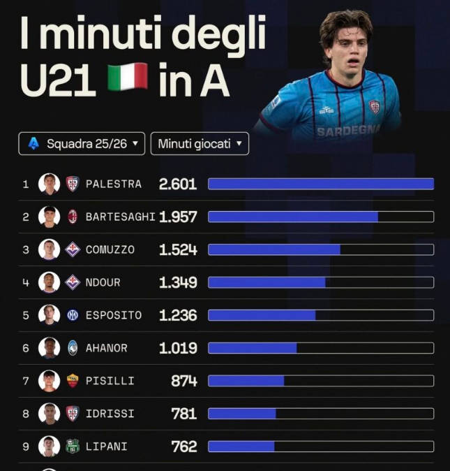 ข้อมูลจริงยืนยันปรากฏการณ์นี้เพิ่มเติม ตัวอย่างเช่น Cagliari ได้ให้เวลาเล่นมากกว่า 2,600 นาทีปาเลสตรา ในขณะที่หลายทีมเช่น ยูเวนตุส ปาร์ม่า และเวโรนาไม่มีโอกาสสำหรับผู้เล่น U21 ในพื้นที่ในฤดูกาลนี้ ความไม่สมดุลนี้หมายความว่ามีเพียงผู้เล่นอายุน้อยในลีกจำนวนน้อยเท่านั้นที่สามารถได้รับโอกาสในการปรากฏตัวที่มั่นคง และคนหนุ่มสาวส่วนใหญ่ไม่สามารถทำอะไรได้บนม้านั่งสำรอง