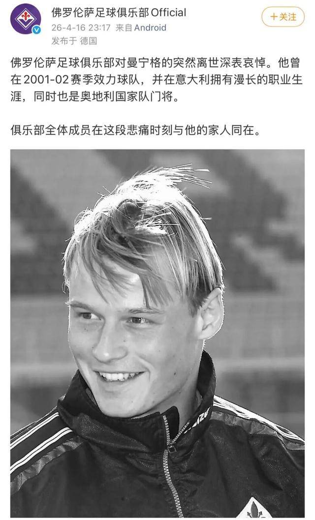 เต ตามรายงานของ Sports Weekly ที่16 เมษายน ฟุตบอลยุโรปมีข่าวร้าย: อดีต "ชาติ" Alexander Manninger เสียชีวิตจากอุบัติเหตุจราจรร้ายแรงเมื่ออายุ 48 ปี