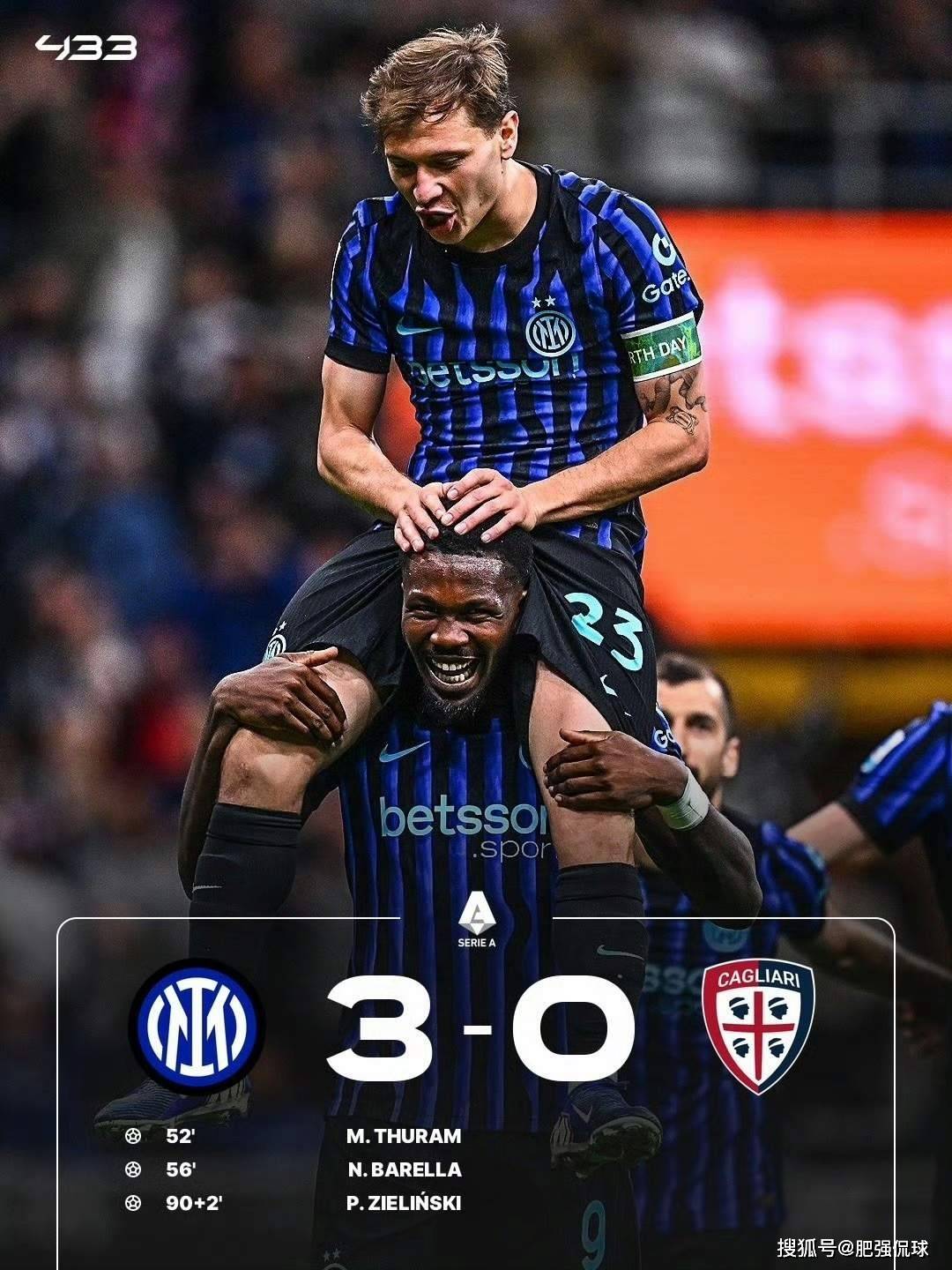 ในช่วงครึ่งแรกของเกม อินเตอร์ มิลาน เล่นได้อย่างสมบูรณ์ หลังจากเสียสองประตูติดต่อกัน ทูรัมก็โดนออดในครึ่งแรกทำประตูได้กลับมา เขาคิดว่ามันอาจจะเป็นเกมที่ต้องแพ้ แต่ในนาทีที่ 49 ถึง 58 ของครึ่งหลัง เขายิงสองประตูใน 10 นาทีใน 10 นาที และยิงอีก 14 นาทีเพื่อคว้าชัยชนะ! เกมนี้กับคากลิอารีก็เช่นกัน แม้ว่าคู่ต่อสู้จะไม่แข็งแกร่ง แต่อินเตอร์ มิลานก็ใช้ความคิดริเริ่มอย่างแท้จริงในครึ่งแรก แต่เขาชนะโมเมนตัมเสมอ อย่างไรก็ตาม หลังจากพักครึ่งทีม ยิงสองประตูติดต่อกันในเวลาไม่ถึง 5,000 ถึง 56 นาทีในเวลาไม่ถึง 5 นาที เทความหวังของคู่ต่อสู้ให้หมดไป!