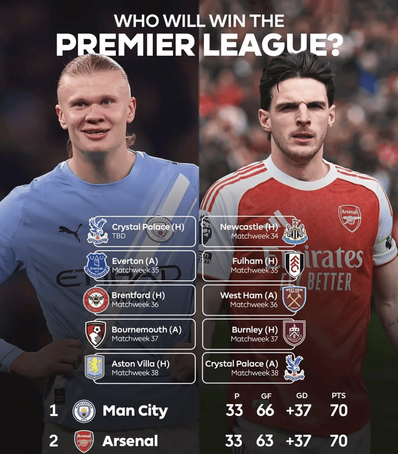 ในอันดับพรีเมียร์ลีก แมนเชสเตอร์ ซิตี้ และ อาร์เซนอล มี 70 แต้ม โดยทั้งคู่ทำประตูได้ 27 แต้ม แมนฯซิตี้ ยิงได้มากกว่า 3 ประตู อาร์เซนอล แมนฯ ซิตี้ แซง อาร์เซนอล ไปครองที่หนึ่งในพรีเมียร์ลีก ในช่วงที่เหลือของฤดูกาล คู่ต่อสู้ของแมนเชสเตอร์ ซิตี้ ได้แก่ คริสตัล พาเลซ, เอฟเวอร์ตัน, เบรนท์ฟอร์ด, บอร์นมัธ และวิลล่า ขณะที่อาร์เซนอลจะเล่นนิวคาสเซิล, ฟูแล่ม, เวสต์แฮม ยูไนเต็ด, เบิร์นลีย์ และคริสตัล พาเลซ แมนเชสเตอร์ ซิตี้ ยังมีภารกิจรอบรองชนะเลิศเอฟเอ คัพ และคู่ต่อสู้คือเซาแธมป์ตันของแชมป์ เดอะกันเนอร์สจะมีสงครามการขัดสีสองรอบกับแอตเลติโกในรอบรองชนะเลิศแชมเปี้ยนส์ลีก