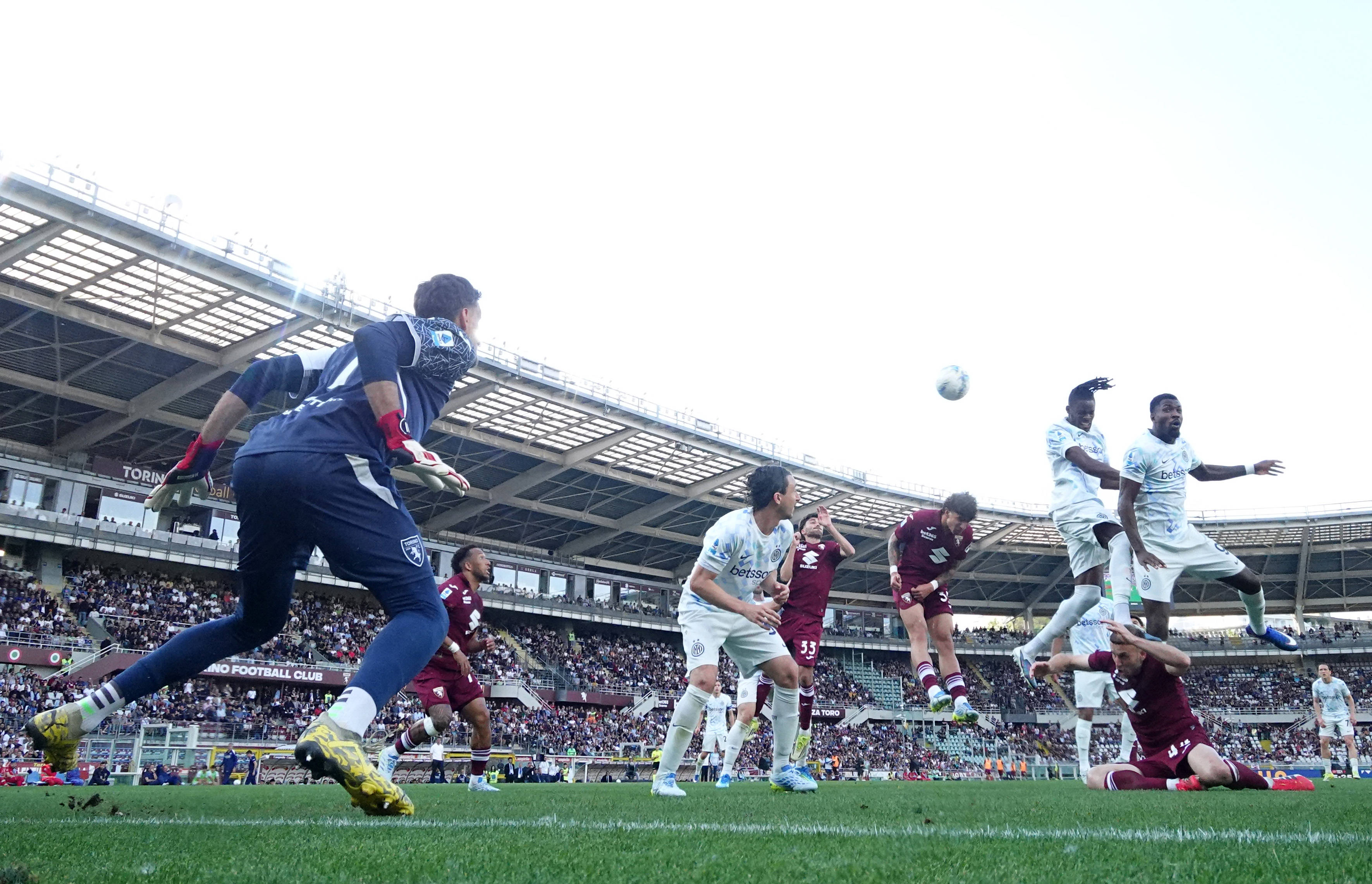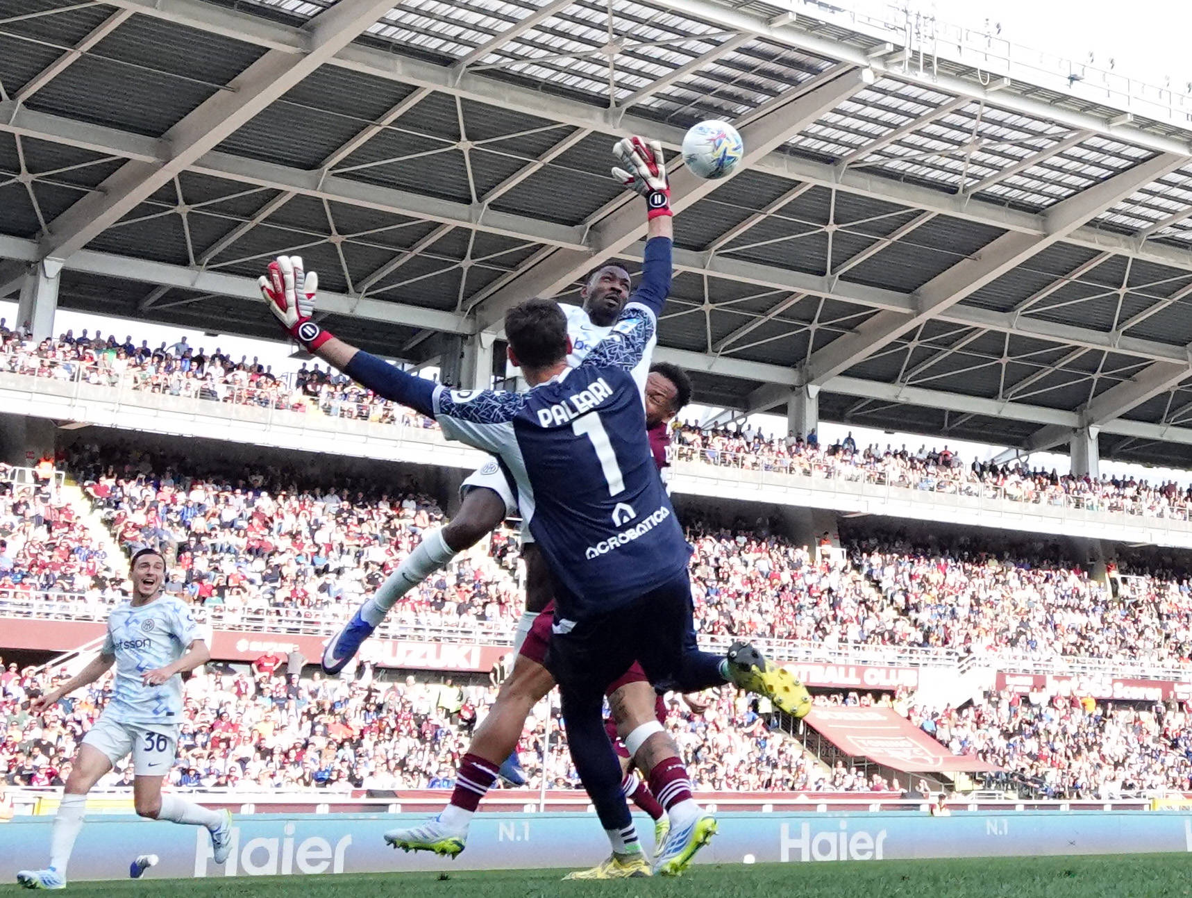 26 เมษายน ผู้เล่น Torino Frasic (ขวา) ทำลายประตูในเกม สำนักข่าวซินหัว (ภาพโดย Alberto Linglia)