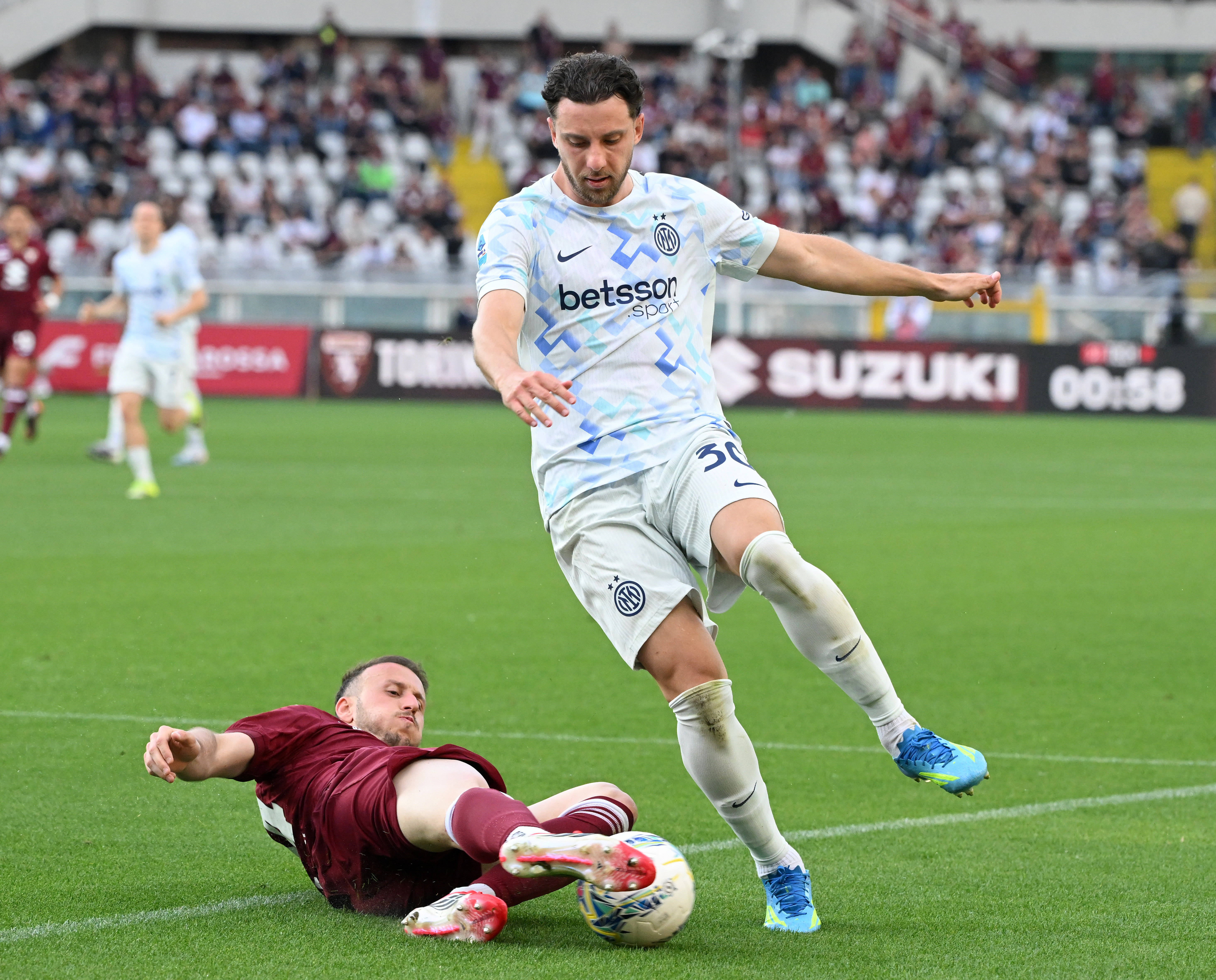 26 เมษายน ผู้เล่น Torino Vlasic (ซ้าย) แข่งขันกับผู้เล่นอินเตอร์มิลาน ออกุสโต ในเกม สำนักข่าวซินหัว (ภาพโดย Alberto Linglia)