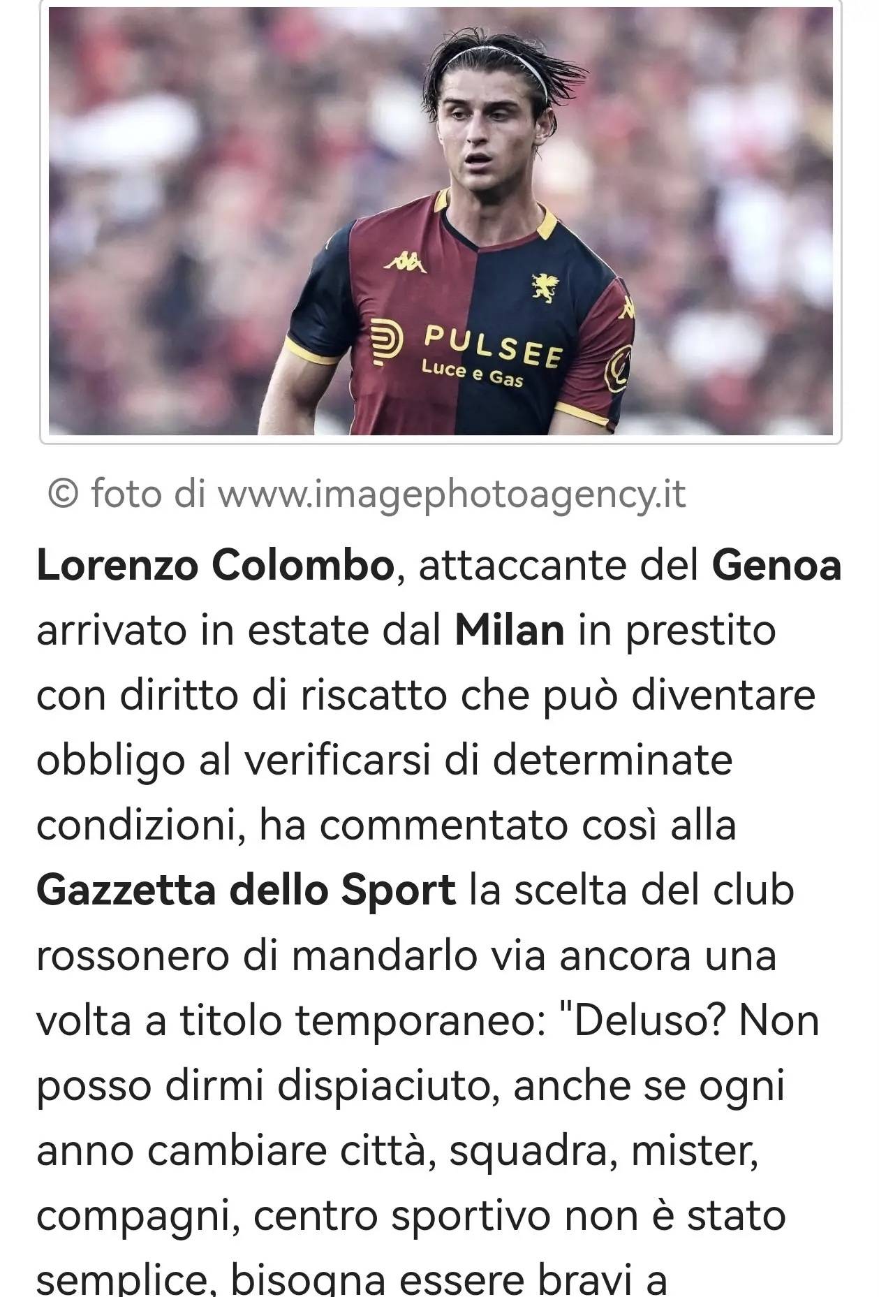กองหน้าของเจนัว ลอเรนโซ่ คอลอมโบ ย้ายมาร่วมทีมด้วยสัญญายืมตัวจากมิลานในช่วงซัมเมอร์นี้ โดยมีเงื่อนไขที่อาจเปลี่ยนเป็นการซื้อขาดได้ (เมื่อบรรลุเงื่อนไขที่กำหนด) ในการให้สัมภาษณ์กับ Gazzetta dello Sport เขาได้แสดงความคิดเห็นเกี่ยวกับการตัดสินใจของมิลานที่ยืมตัวเขาออกไปอีกครั้ง: