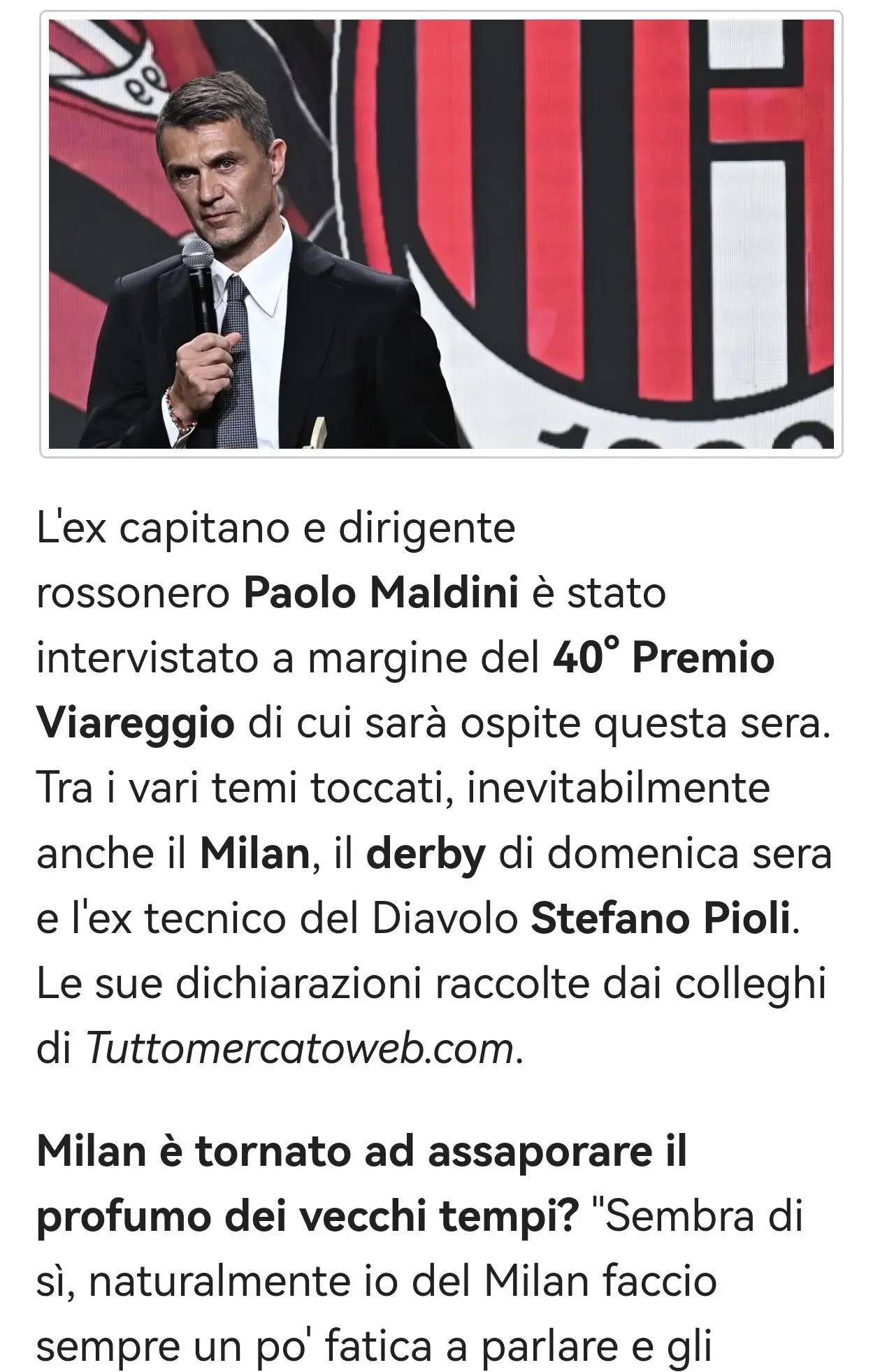อดีตกัปตันและสมาชิกคณะกรรมการของเอซี มิลาน เปาโล มัลดินี ได้กล่าวในงานมอบรางวัลเวียเรจโจ ครั้งที่ 40 (เขาจะเข้าร่วมงานในค่ำคืนนี้ในฐานะแขกรับเชิญ) โดยได้พูดถึงหัวข้อต่างๆ รวมถึงมิลาน, การแข่งขันดาร์บี้ในคืนวันอาทิตย์, และอดีตผู้จัดการทีมรอสโซเนรี สเตฟาโน ปิโอลี: